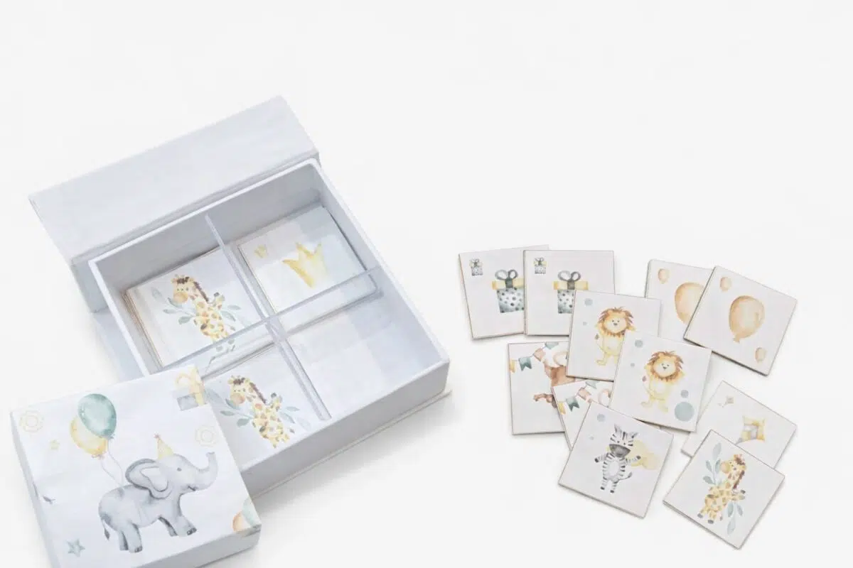 Nosso Jogo da Memória da Coleção Safari Kids é composto por peças ilustradas com aquarelas suaves de animaizinhos encantadores, balões e elementos lúdicos que despertam a curiosidade e o afeto desde o primeiro olhar.