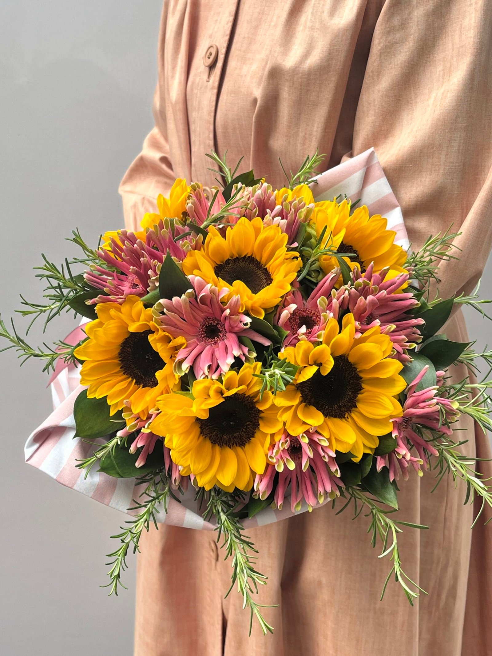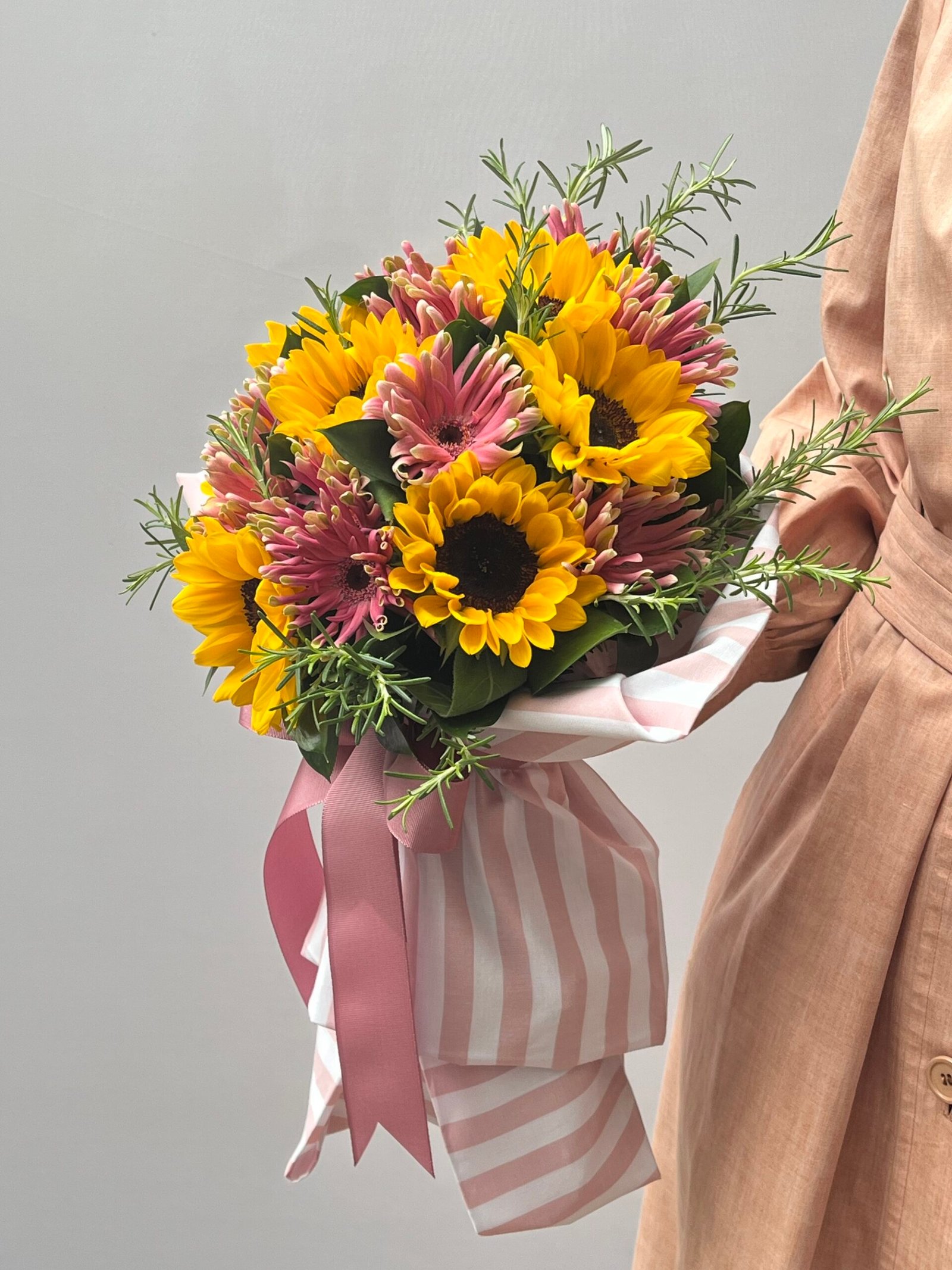 Buquê de girassóis, gérberas rosadas, folhas de alecrim e ruscus, envolto em tecido de algodão e fita de gorgorão rosé.