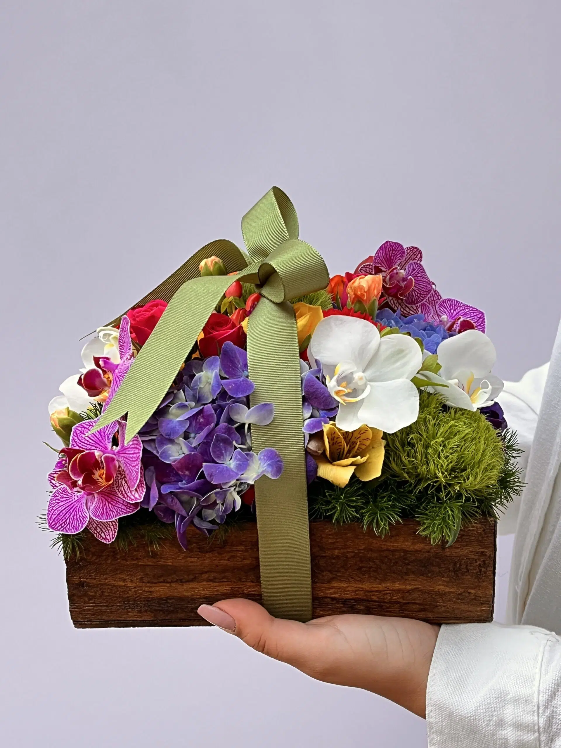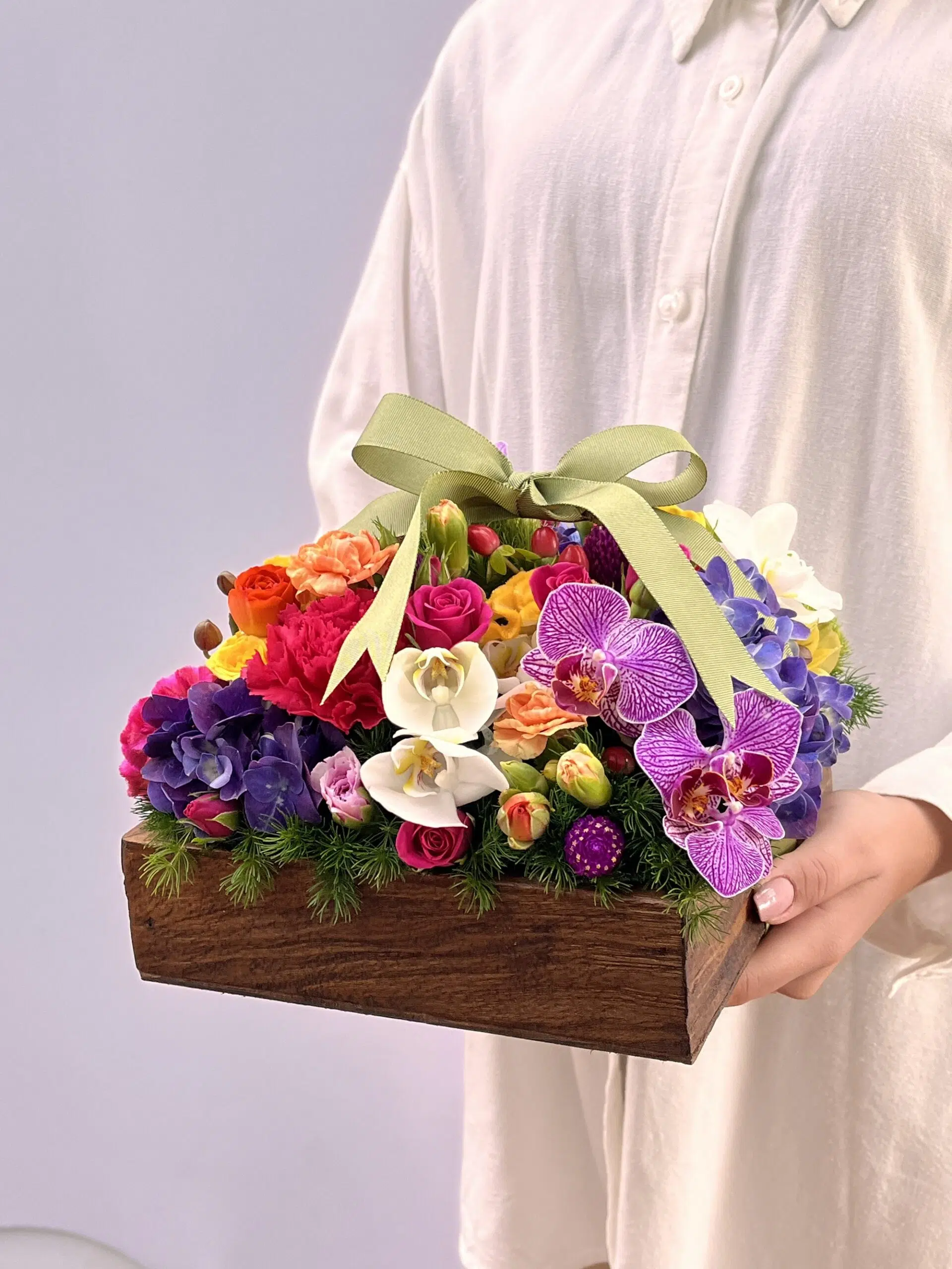 Este arranjo floral reúne elegância e alegria em uma charmosa caixa de madeira rústica, composto por uma seleção de flores nobres e coloridas.