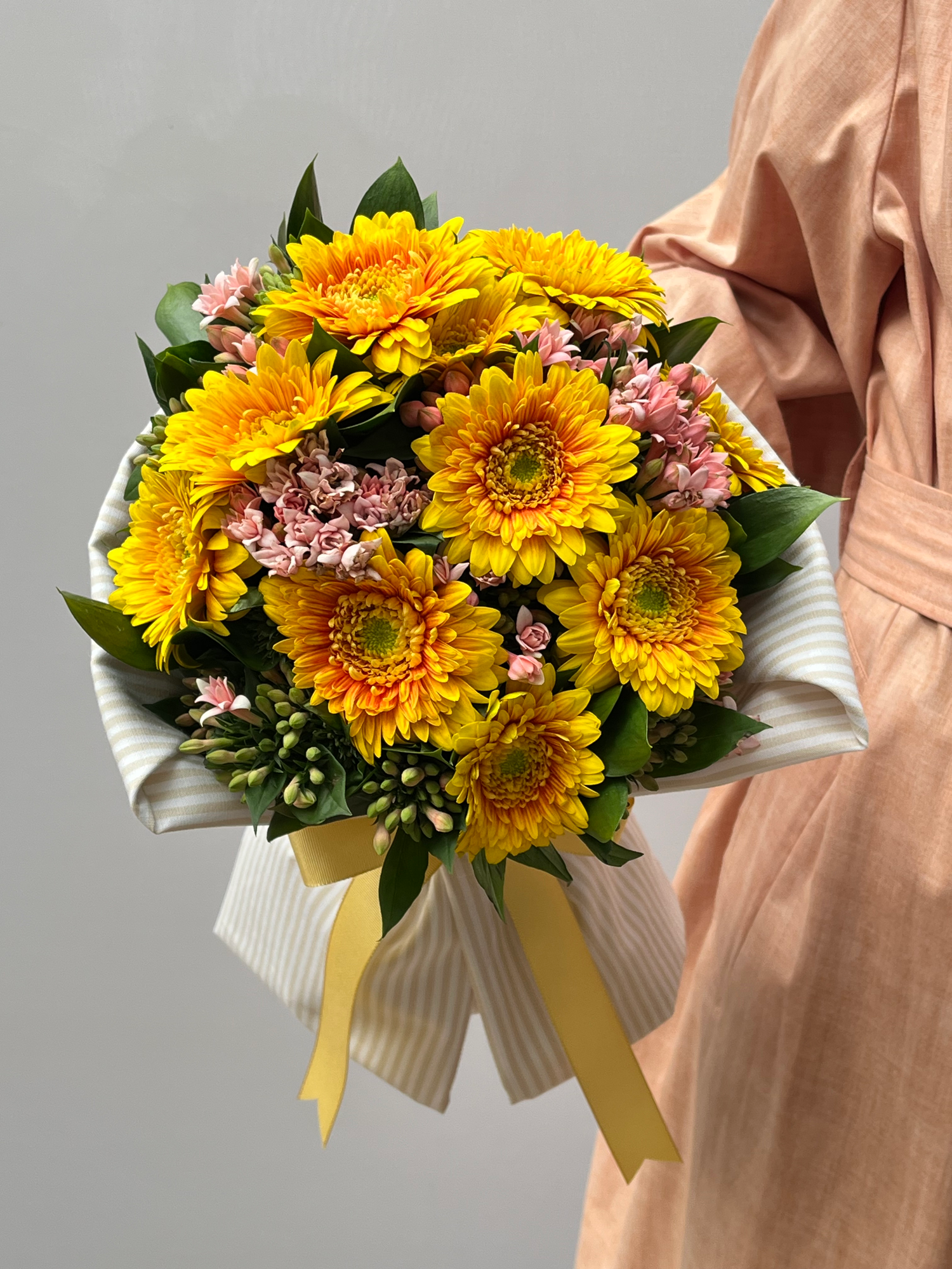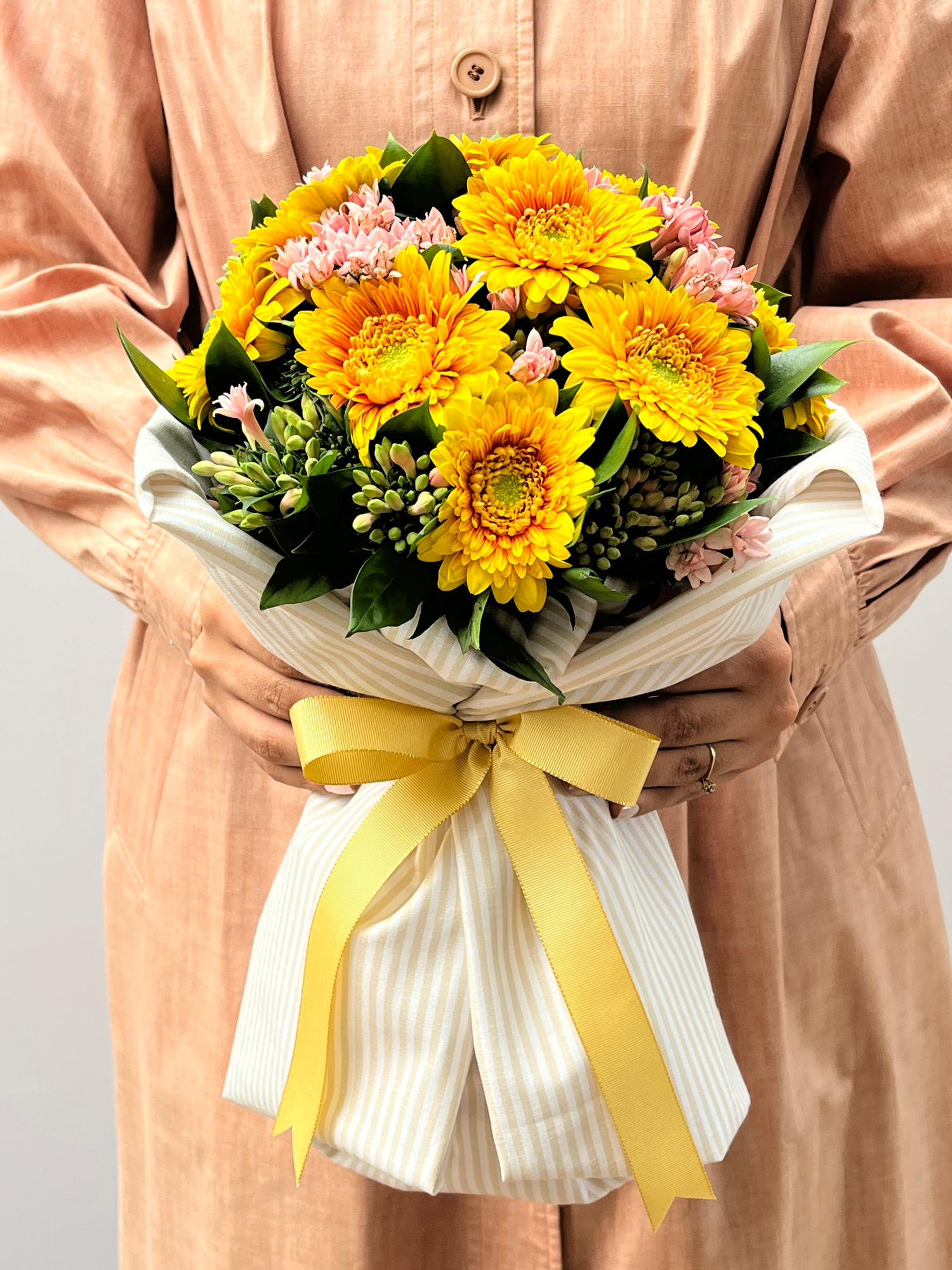Buquê com 10 gérberas amarelas, bouvardias rosas e alecrim, envolto em tecido de algodão e finalizado com fita de gorgorão.