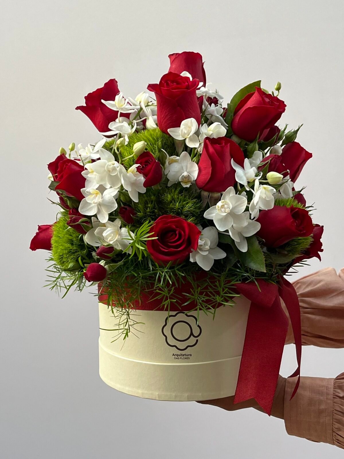 Box de Rosas vermelhas, Mini Orquídeas Phalaenópsis e Green Balls.
