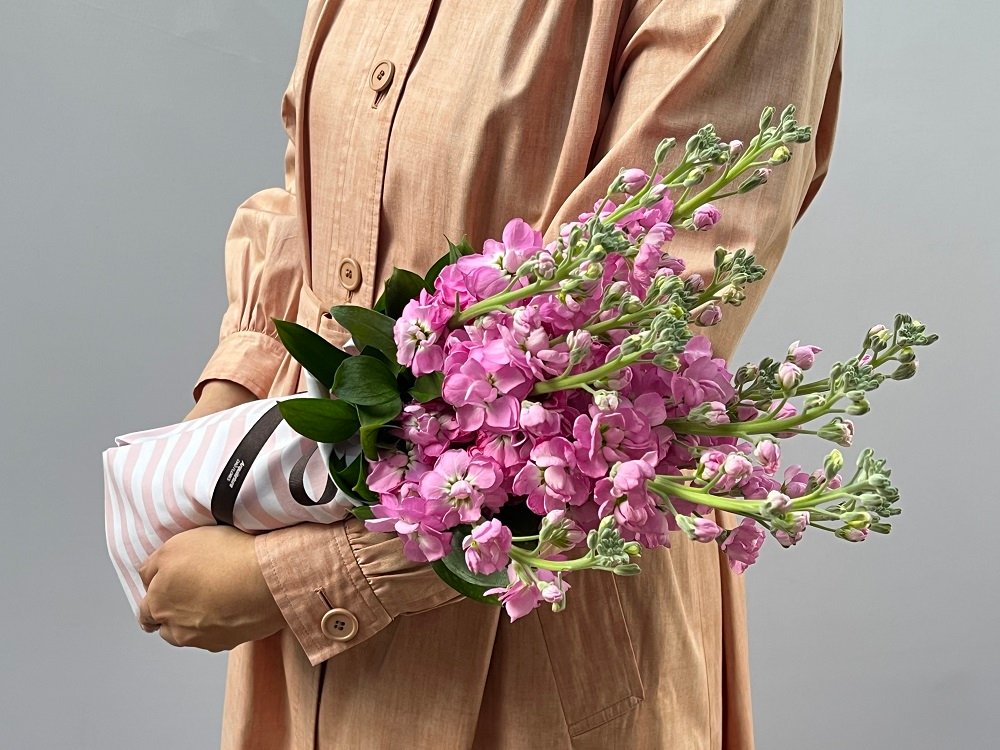 Buquê de goivos rosados envolto em tecido de algodão e laço de gorgorão marrom.