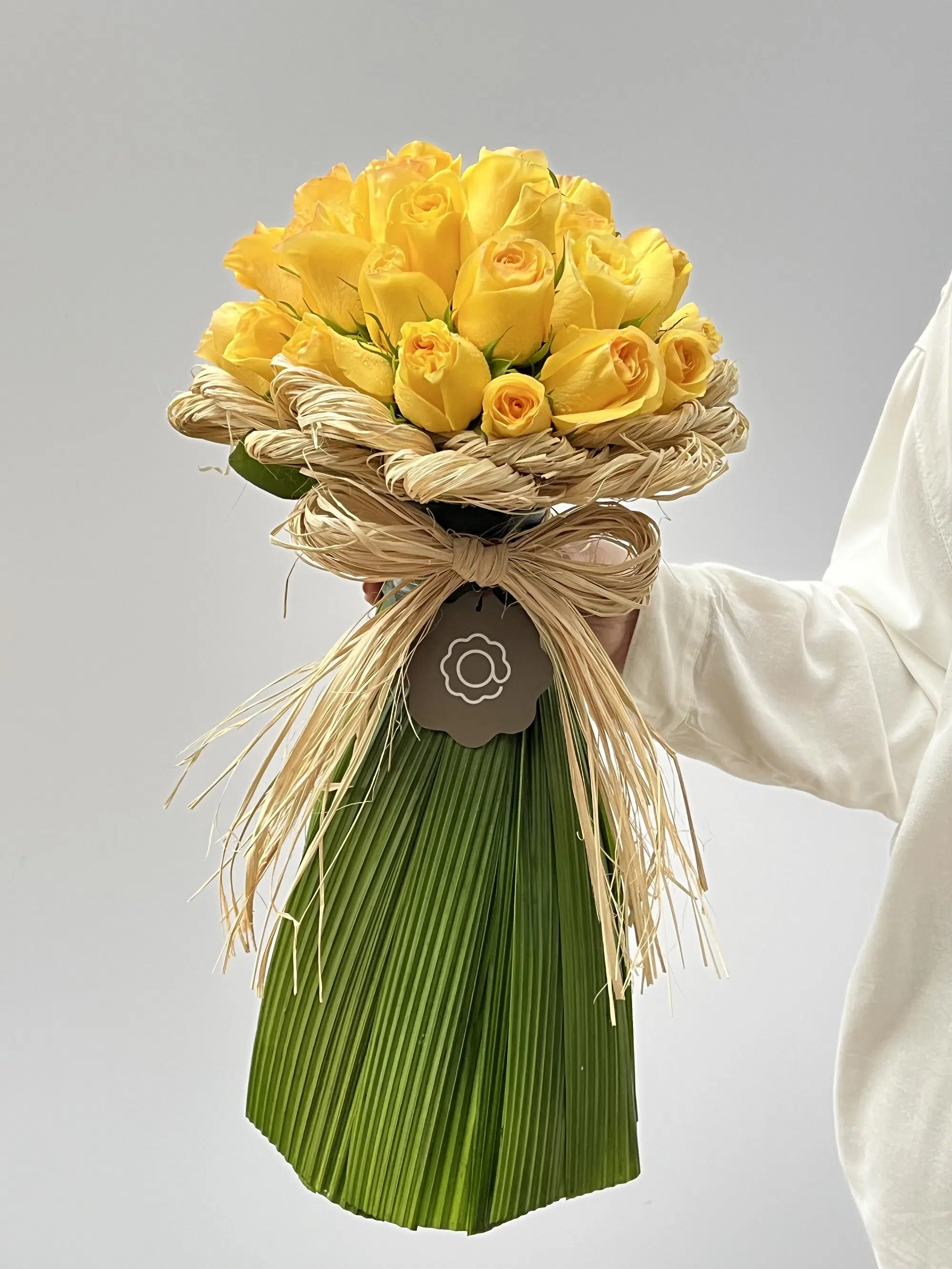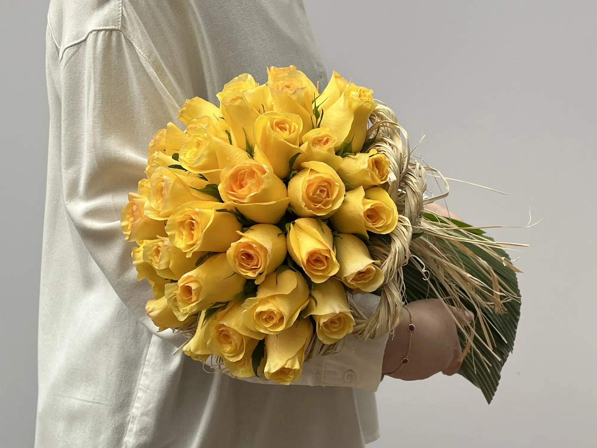 30 Rosas amarelas, folhas verdes e fios de Rafias.