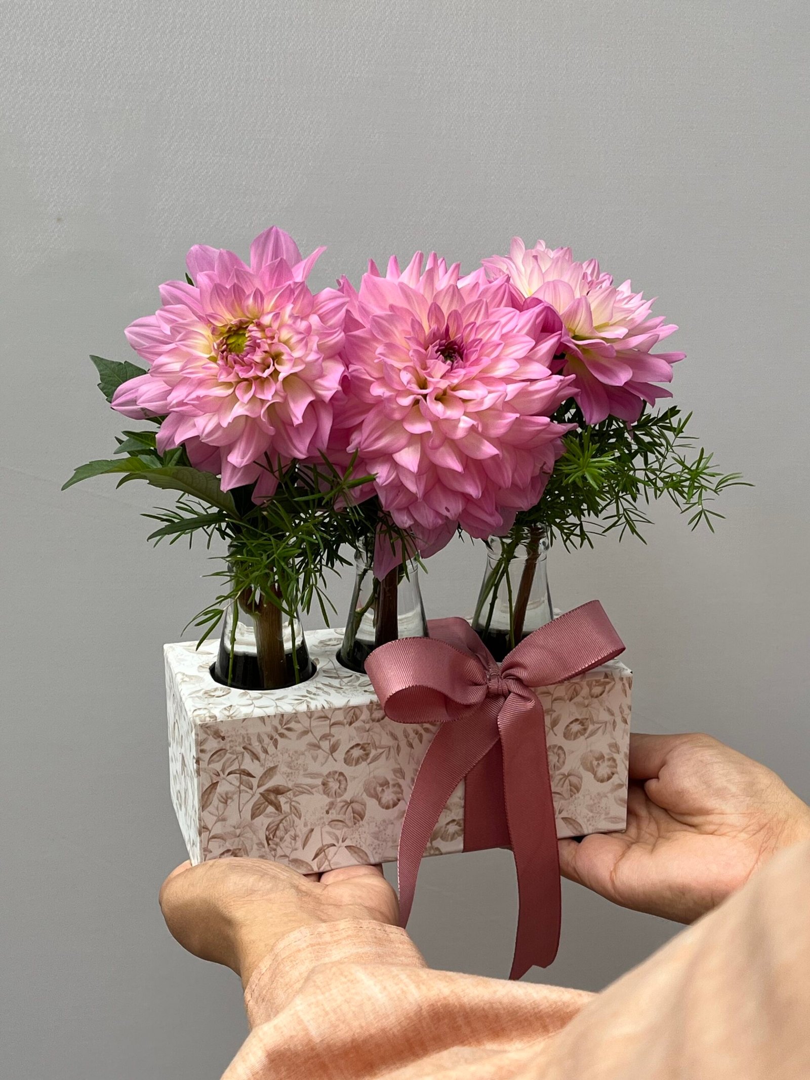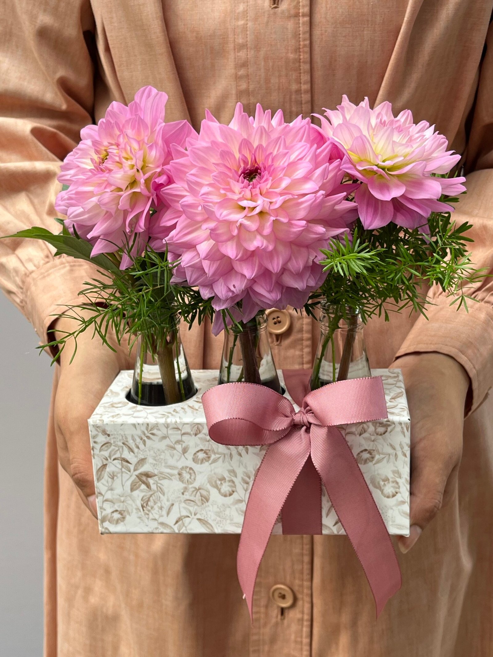 Box com Dálias em frascos de vidro transparente.