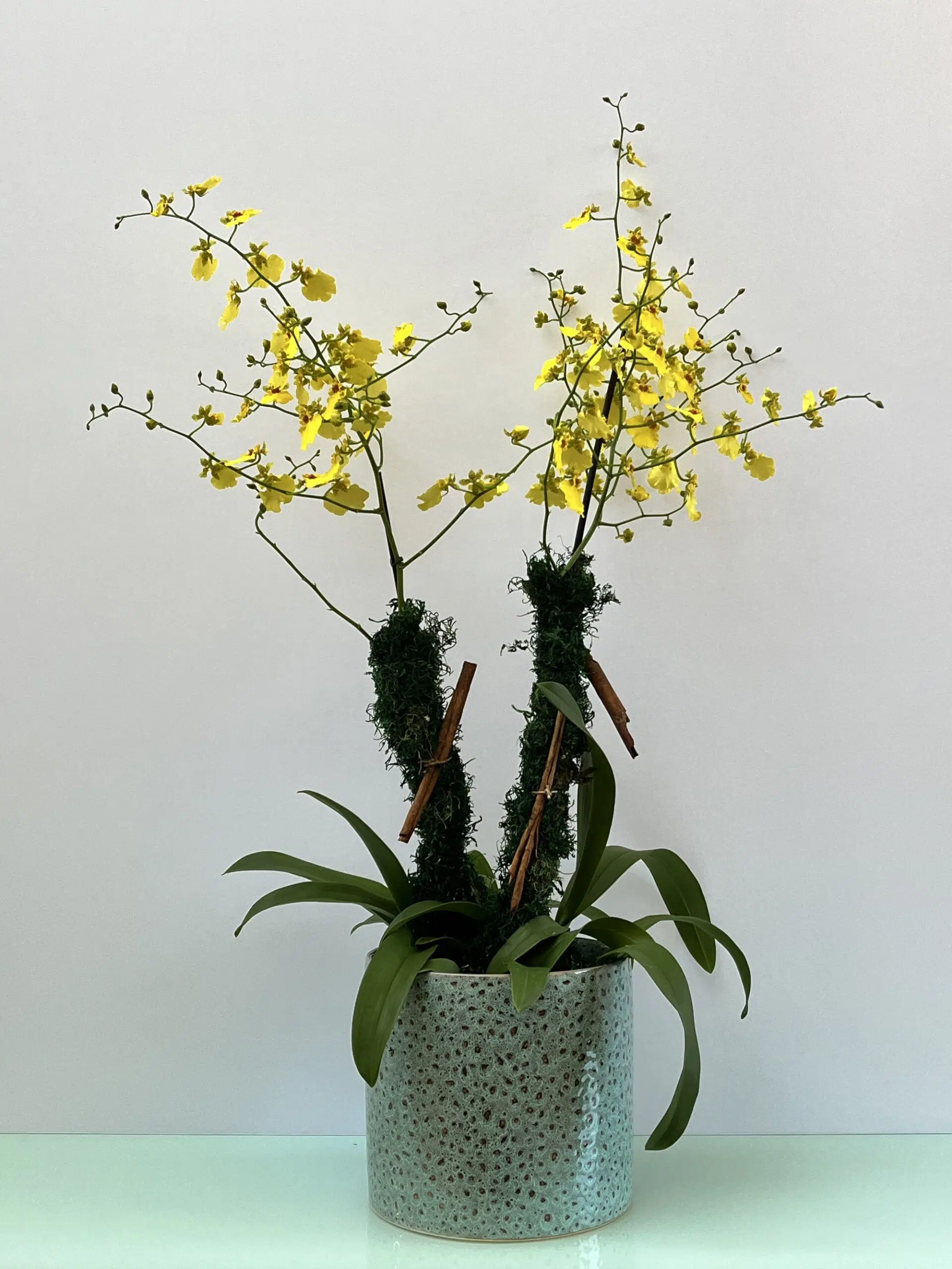 Radiante e elegante, o arranjo Arches transmite a beleza única das Orquídeas Chuva de Ouro de 02 hastes em vaso de cerâmica.