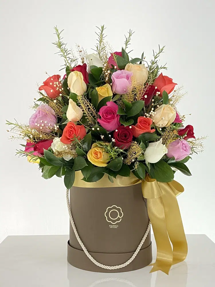 Uma combinação perfeita de 50 Rosas coloridas, Mini flores desidratadas, Folhas de Ruscus e Alecrins em uma box com fita cetim.