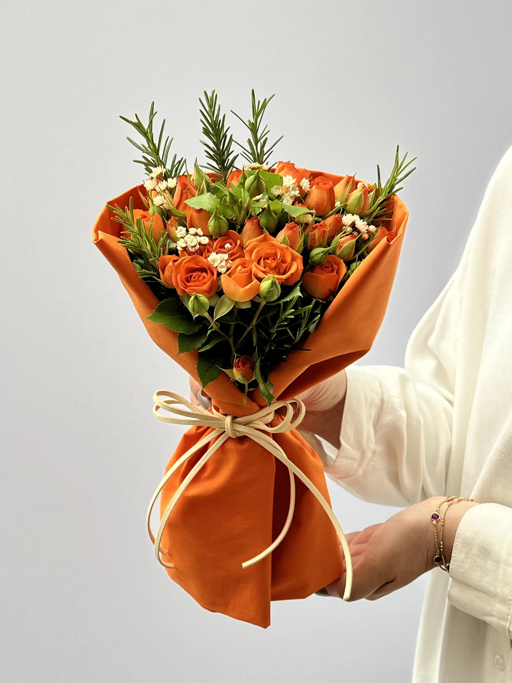 Mini buquê com Mini Rosas laranjas e alecrins, envolto em tecido laranja com laço de camurça.