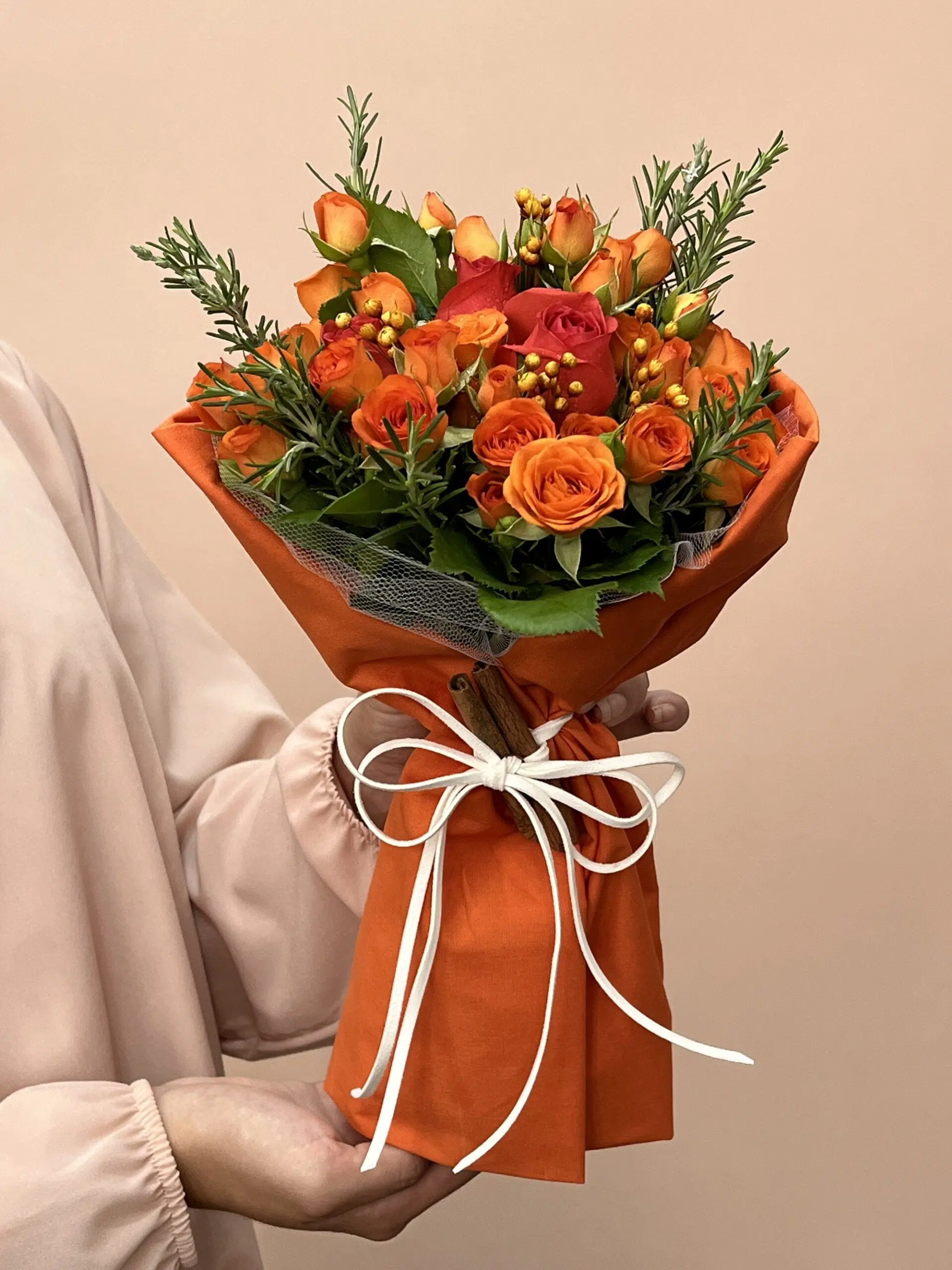 Lindo buquê “Atena“, composto por Mini Rosas, Rosas e Alecrim envolto em tecido. Presenteie com carinho!