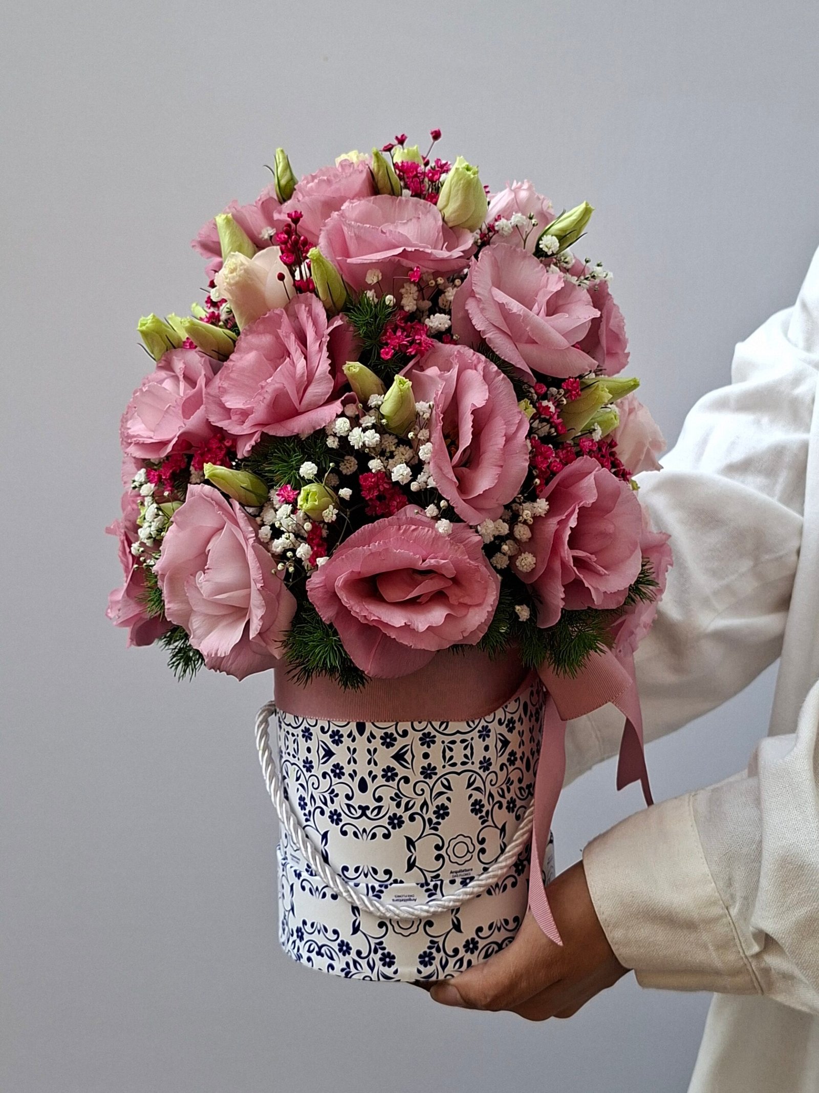 Box de Lisianthus rosa, Gypsophilas, mini flores secas e laço de gorgorão rosa.