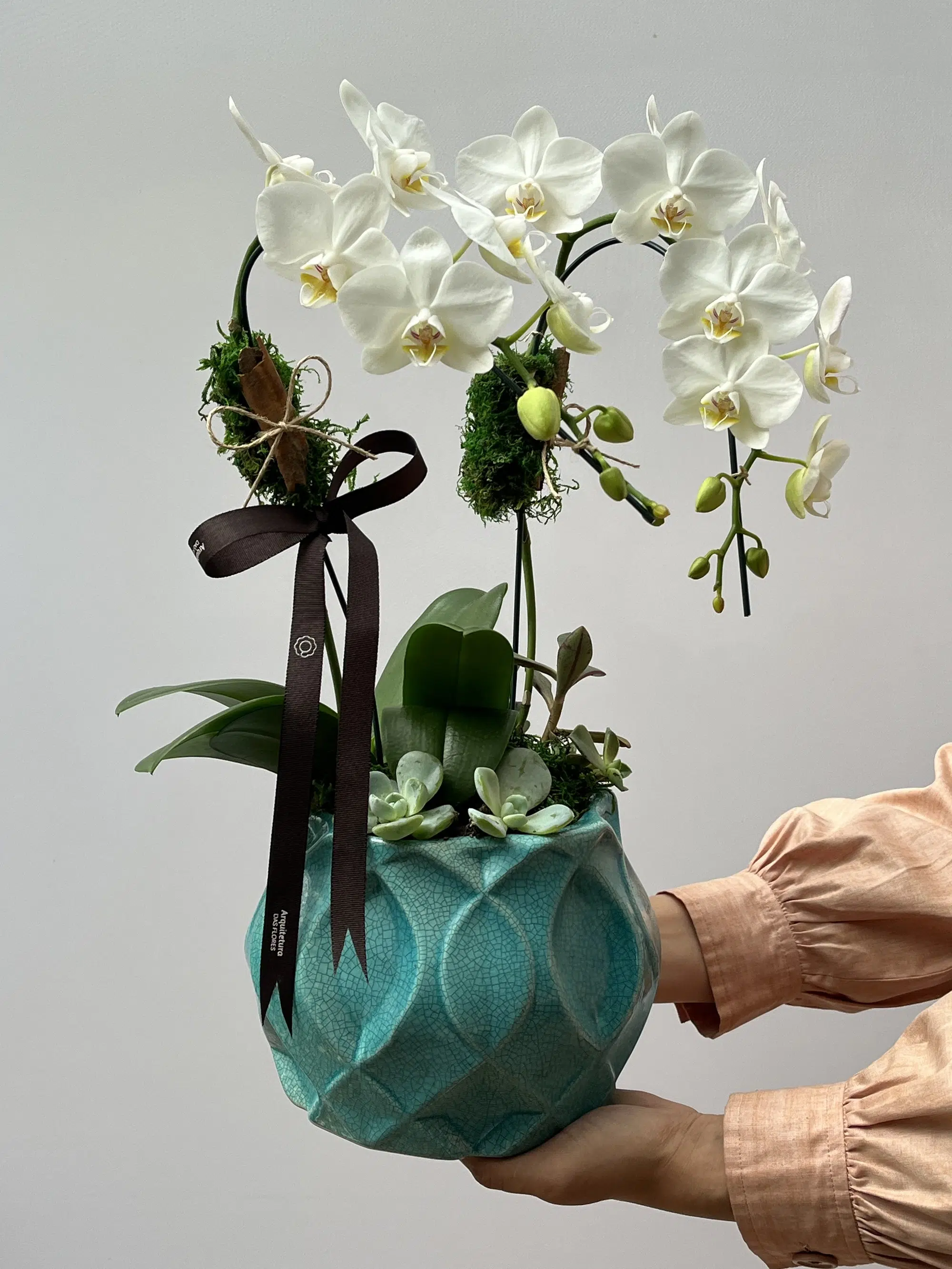 Mini Orquídea Phalaenopsis com 02 hastes, plantada em cachepô de cerâmica, com acabamento em musgo desidratado, Suculentas, canelas e laço de gorgorão marrom.