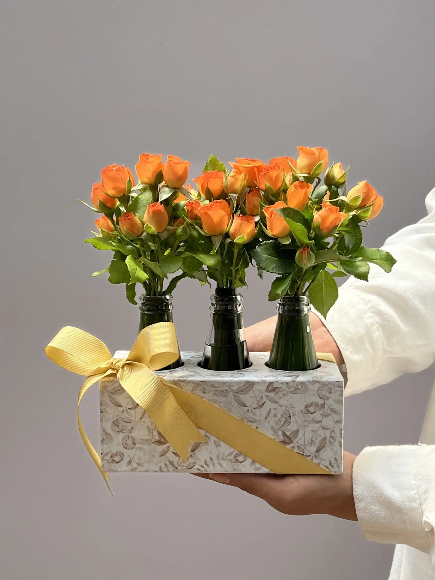 Uma Box composta por Mini Rosas laranjas, acomodados em delicadas garrafinhas de vidro.