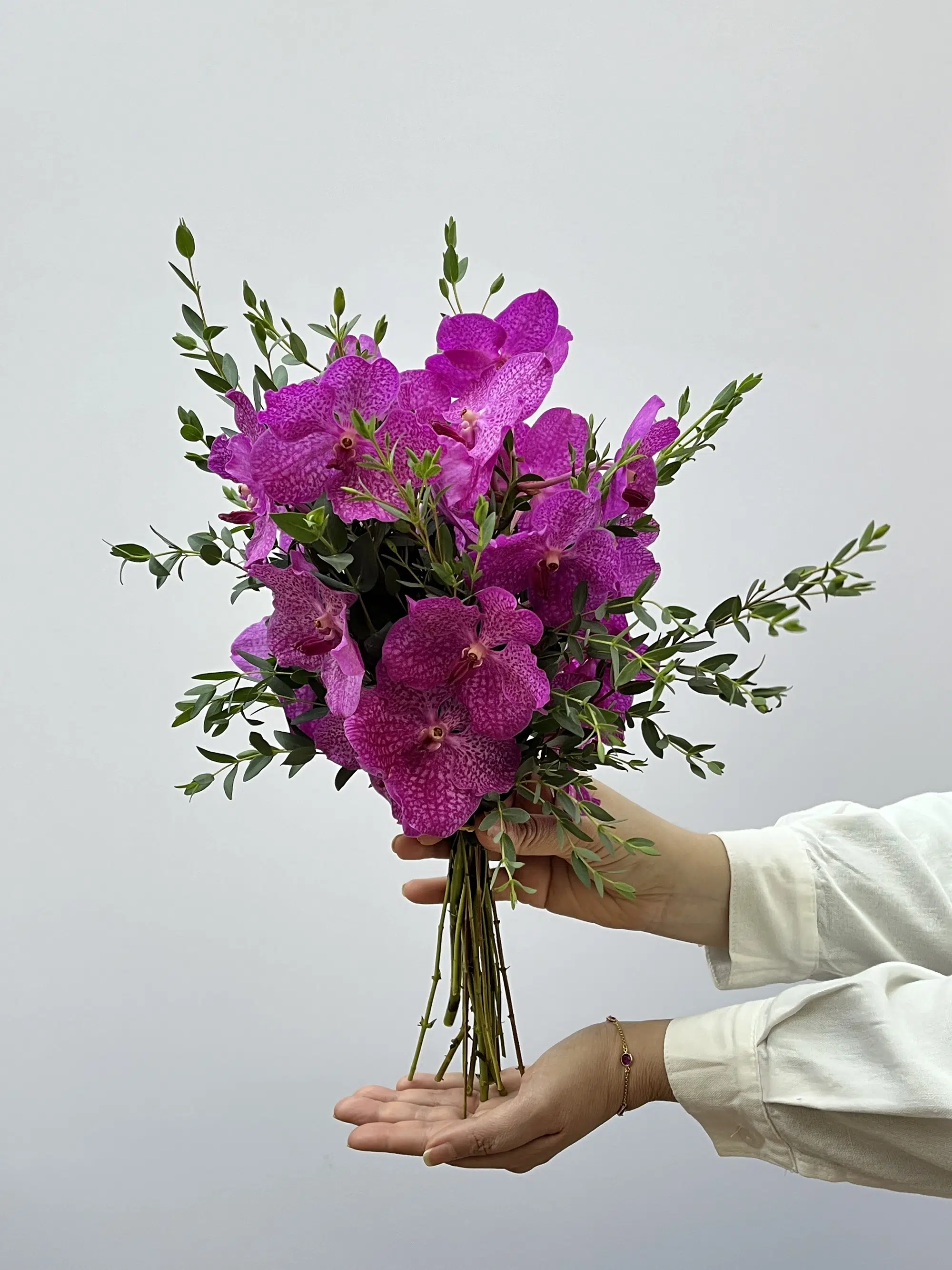 Orquídea Vanda, Mini Eucaliptos, tecido de algodão crú e laço de gorgorão marrom.