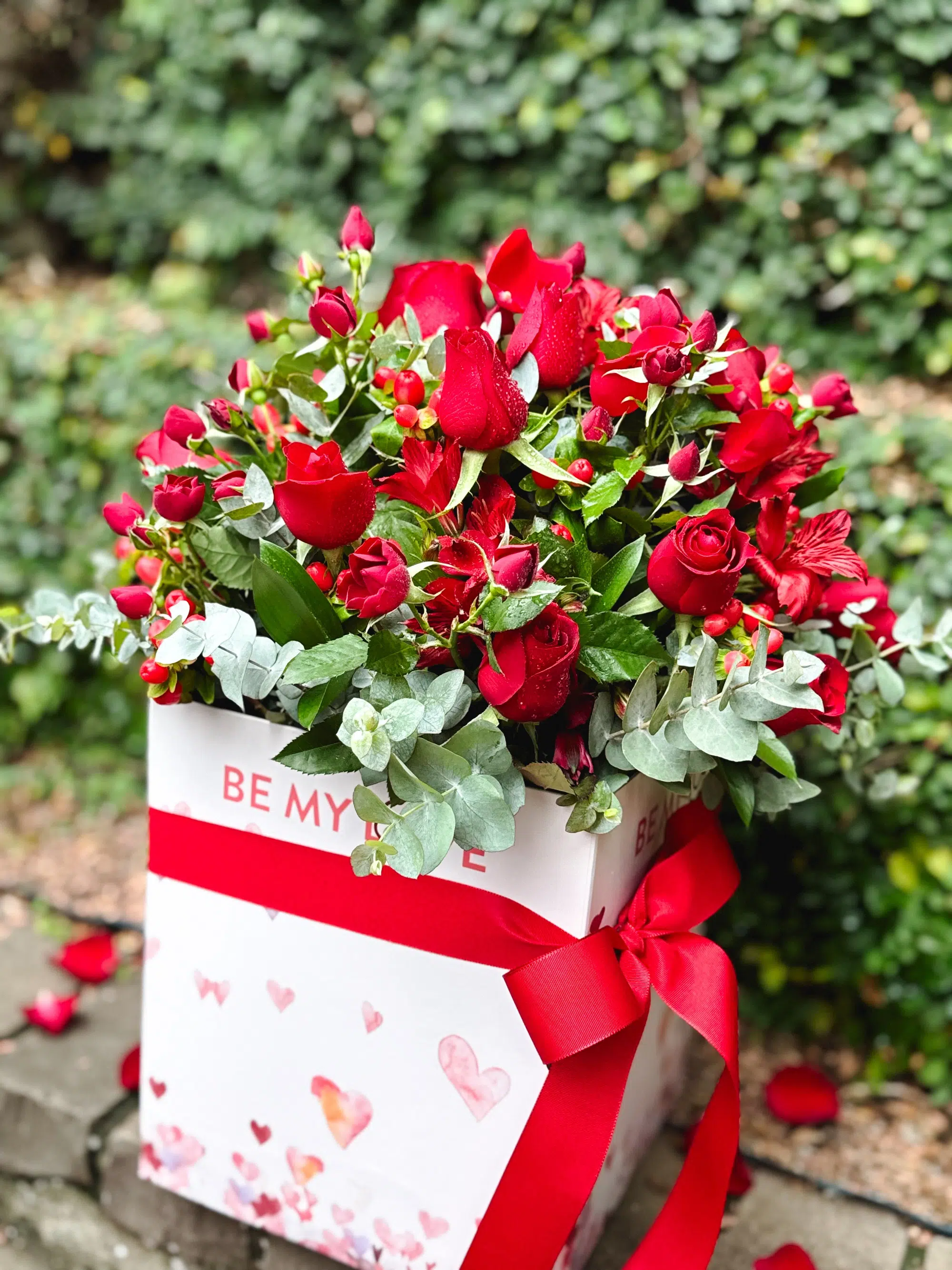 Maravilhosa Box exclusiva com lindas rosas-vermelhas, mini rosas, entre outras flores que fazem uma composição perfeita, para impressionar seu amor e arrancar suspiros.