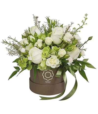As mais lindas e perfumadas Rosas, Mini Rosas e Hortênsias, servem de criação para este encantador arranjo “Blanc Pur“. Presenteie com suavidade e delicadeza das flores brancas.