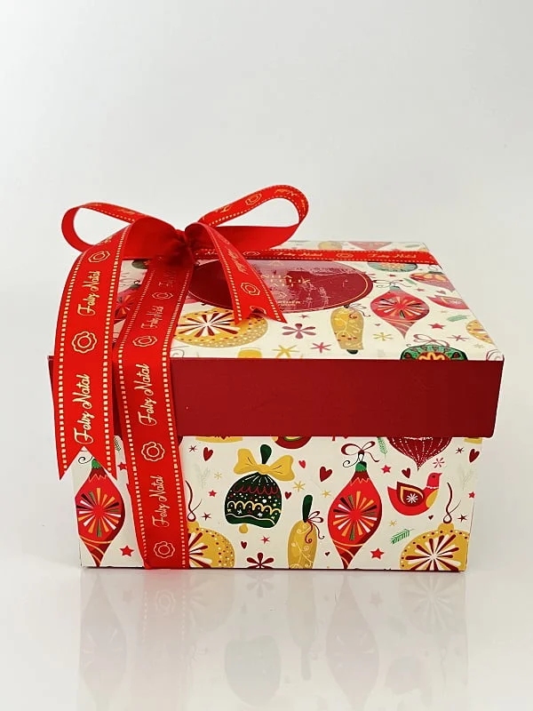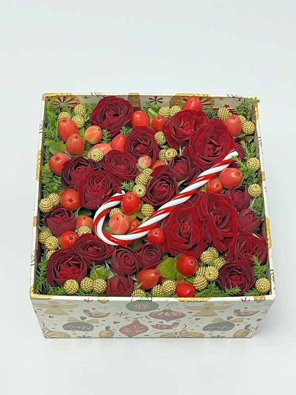 Adorável box natalina com estampa personalizada da coleção “Natal: tempo de celebrar o amor”, destaca a beleza das Mini Rosas vermelhas, Hypericuns e detalhes dourados.