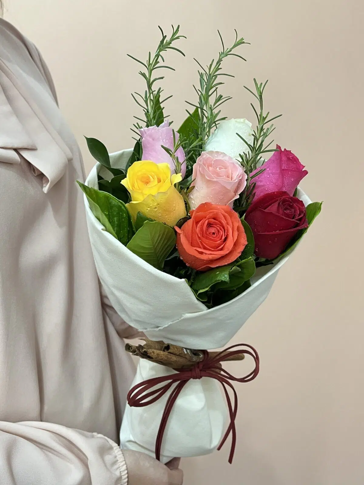 Buquê de 07 Rosas coloridas em tecido de algodão cru e laço de camurça.