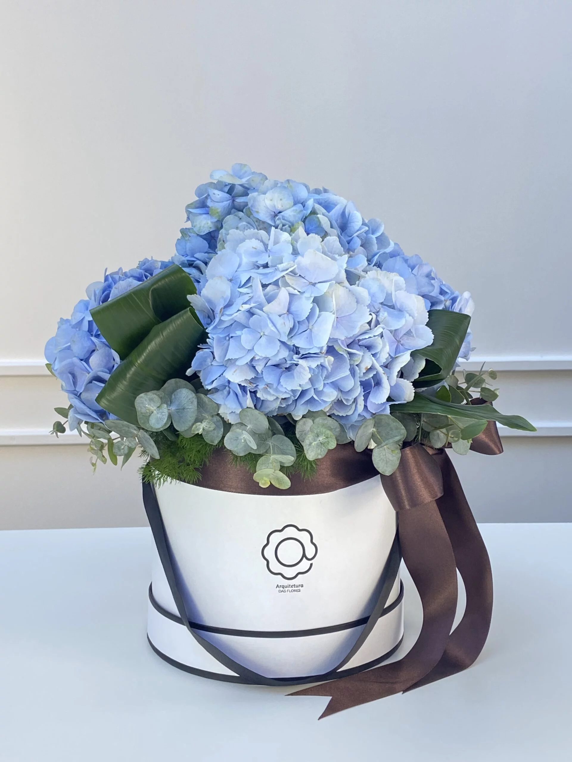 Box, hortênsia, eucalipto, aspidistra e fita de cetim.