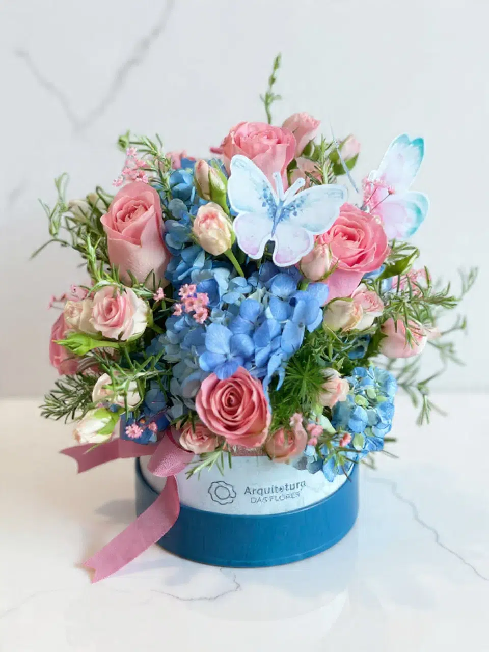 Box de Rosas, Mini Rosas, Hortênsias, Mini Flores desidratadas, Alecrins e figuras de borboletas.