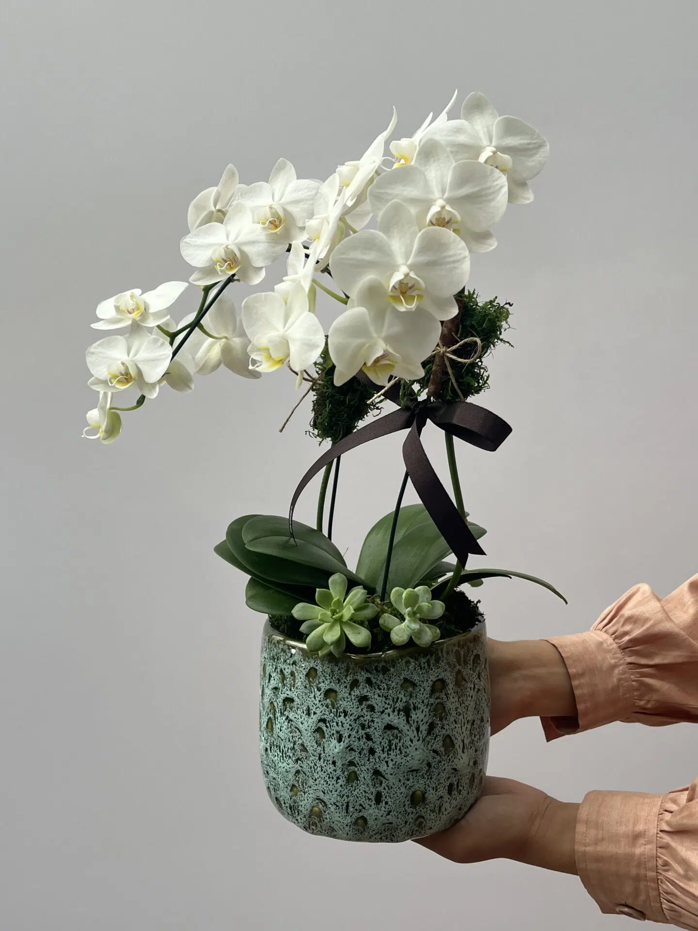 Mini Orquídea Phalaenopsis com 02 hastes, plantada em cachepô de cerâmica, com acabamento em musgo desidratado, Suculentas, canelas e laço de gorgorão marrom.