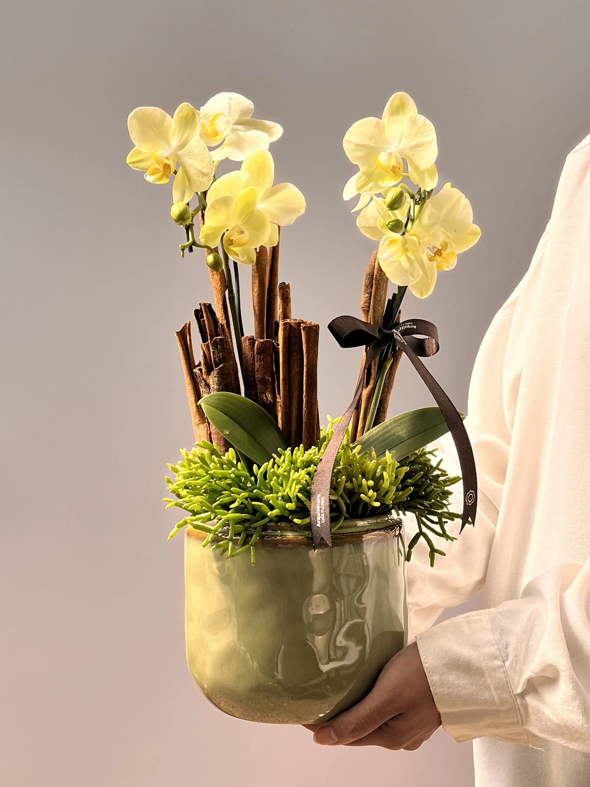Mini Orquídea Phalaenopsis com 02 hastes, plantada em cachepô de cerâmica, adornada com Canelas e laço de gorgorão marrom.