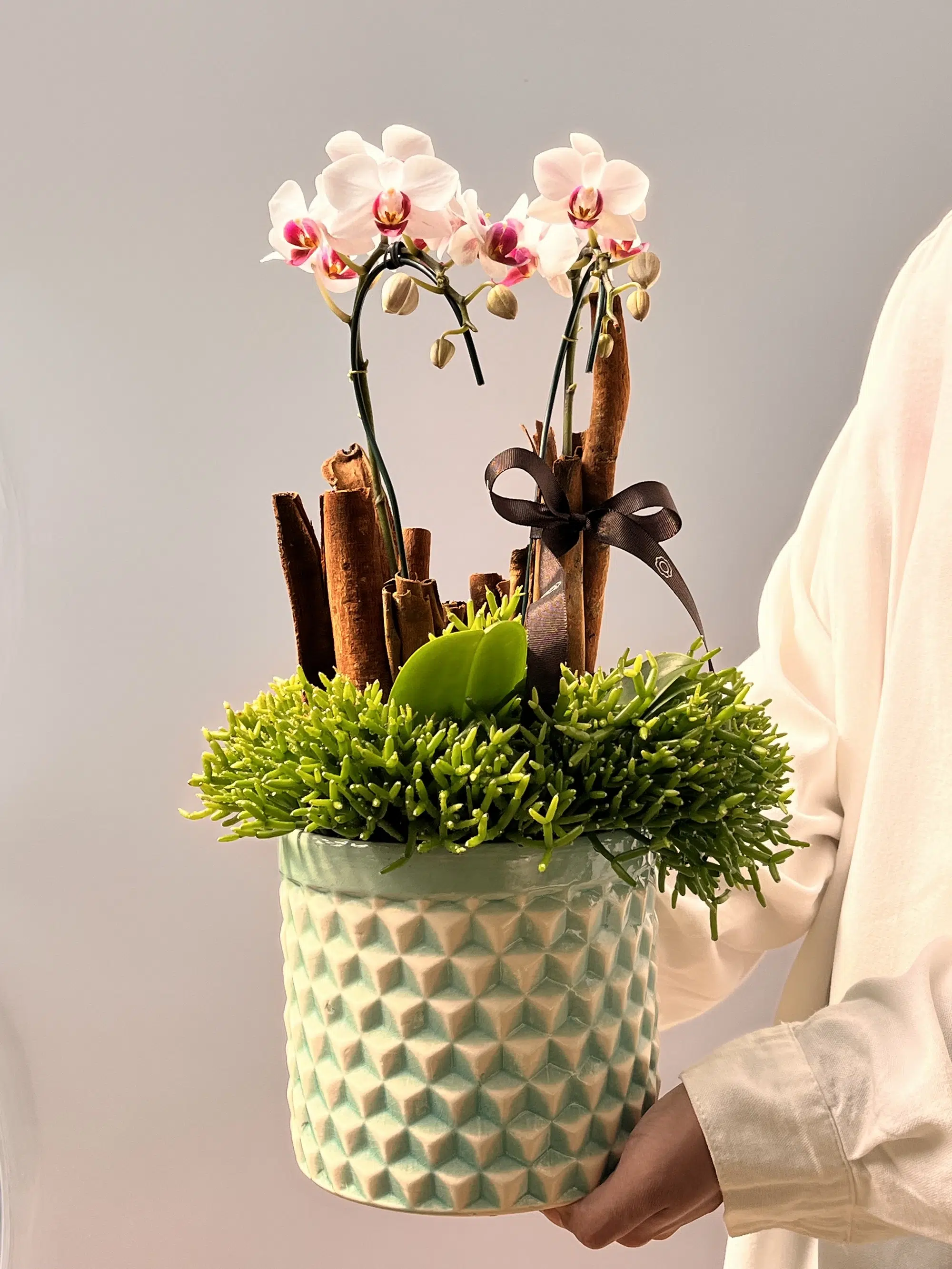 Mini Orquídea Phalaenopsis com 02 hastes, plantada em cachepô de cerâmica, adornada com Canelas e laço de gorgorão marrom.