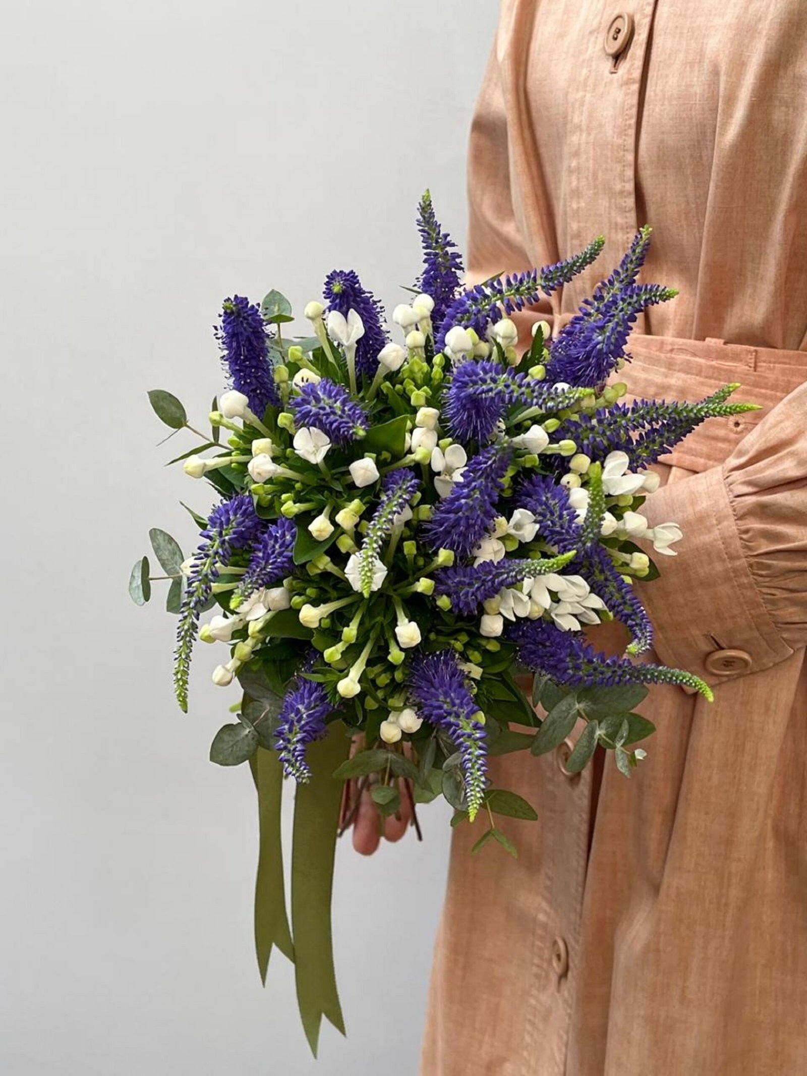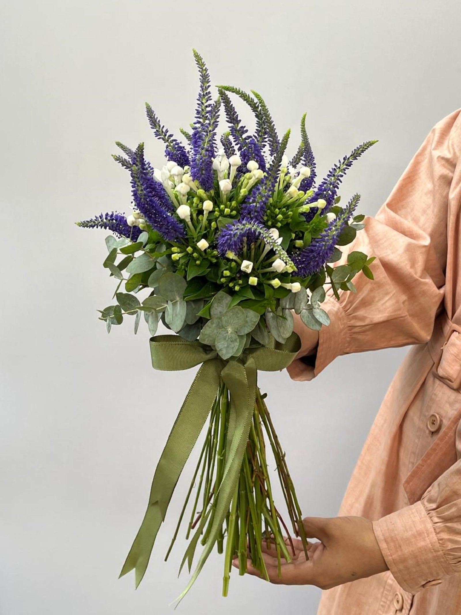 Buquê de verônicas roxas, bouvardias brancas envolvidas em eucaliptos e finalizado com fita de gorgorão verde.
