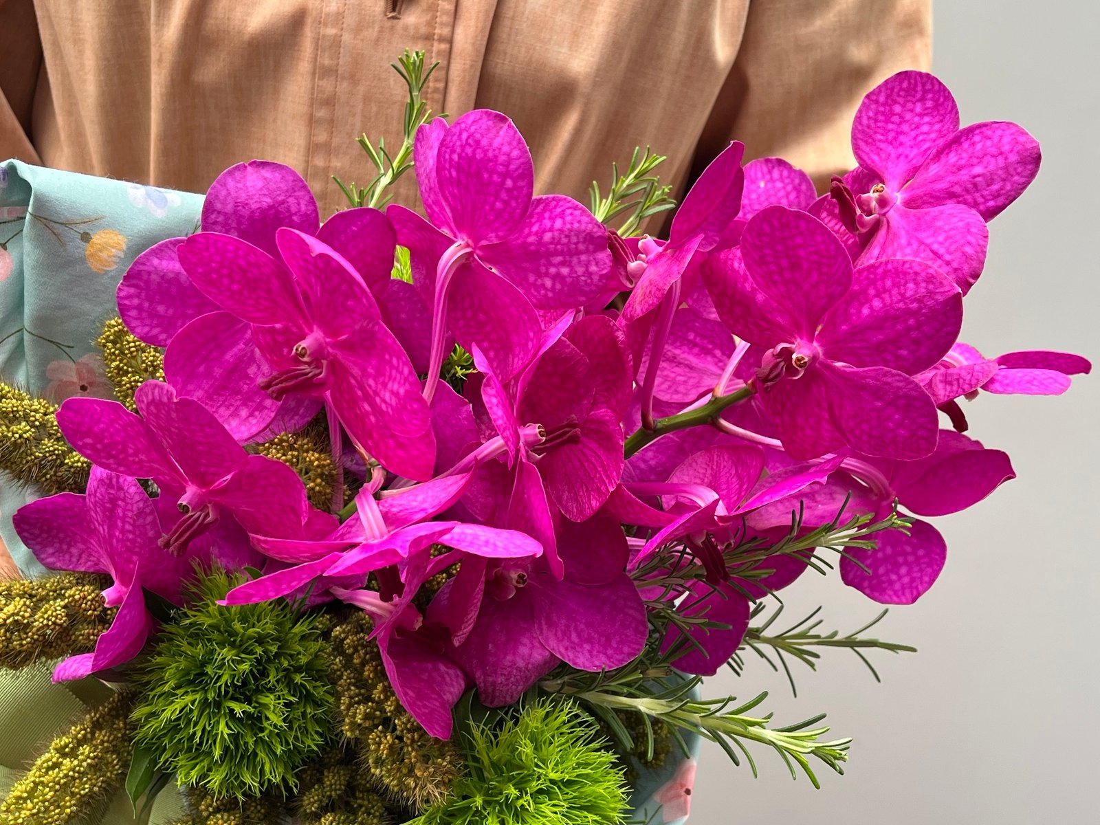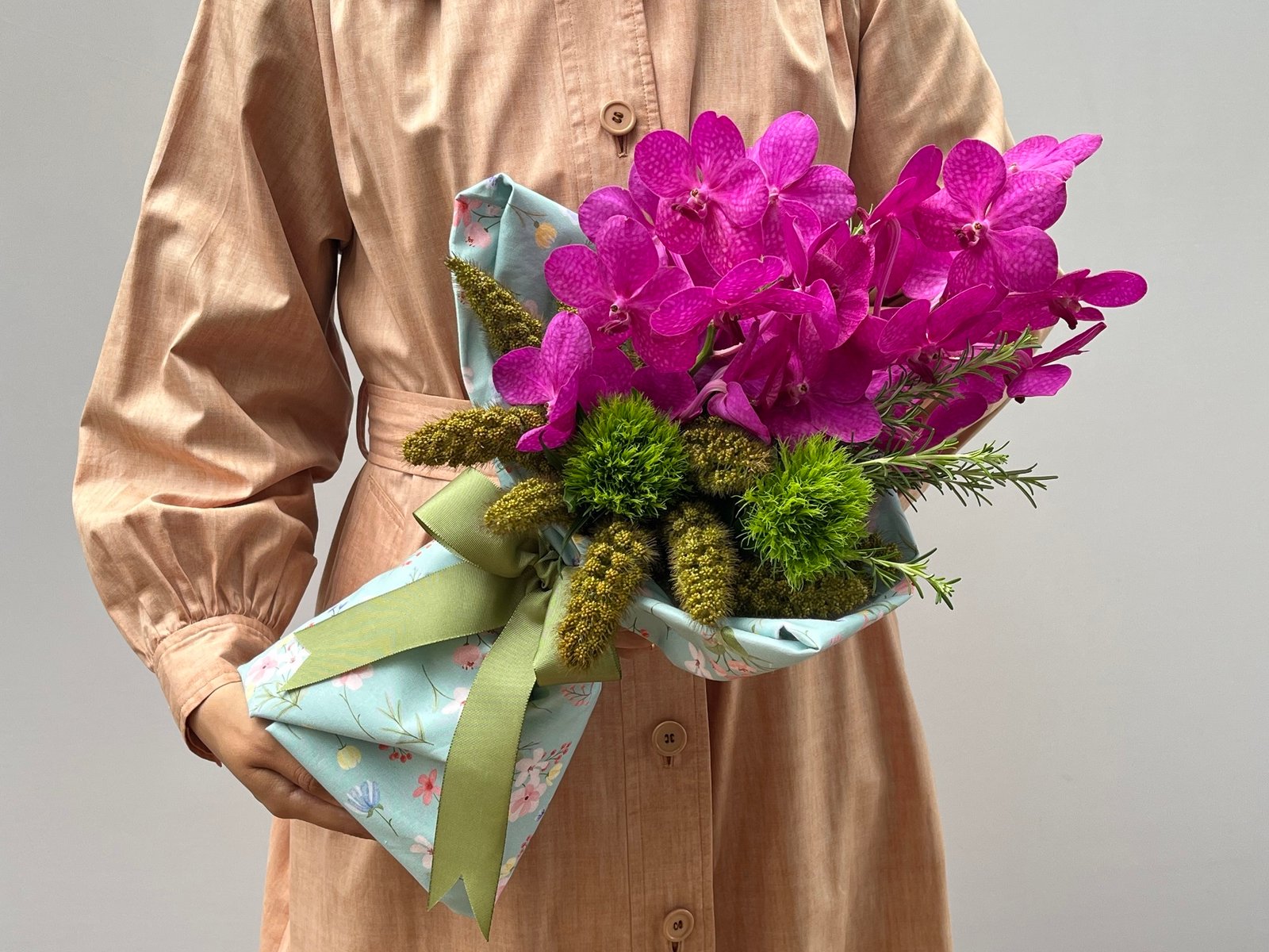 Buquê de Orquídea Vanda e Green Balls, Trigo Aiwa e Alecrim envolto em tecido de algodão e finalizado com laço de gorgorão.