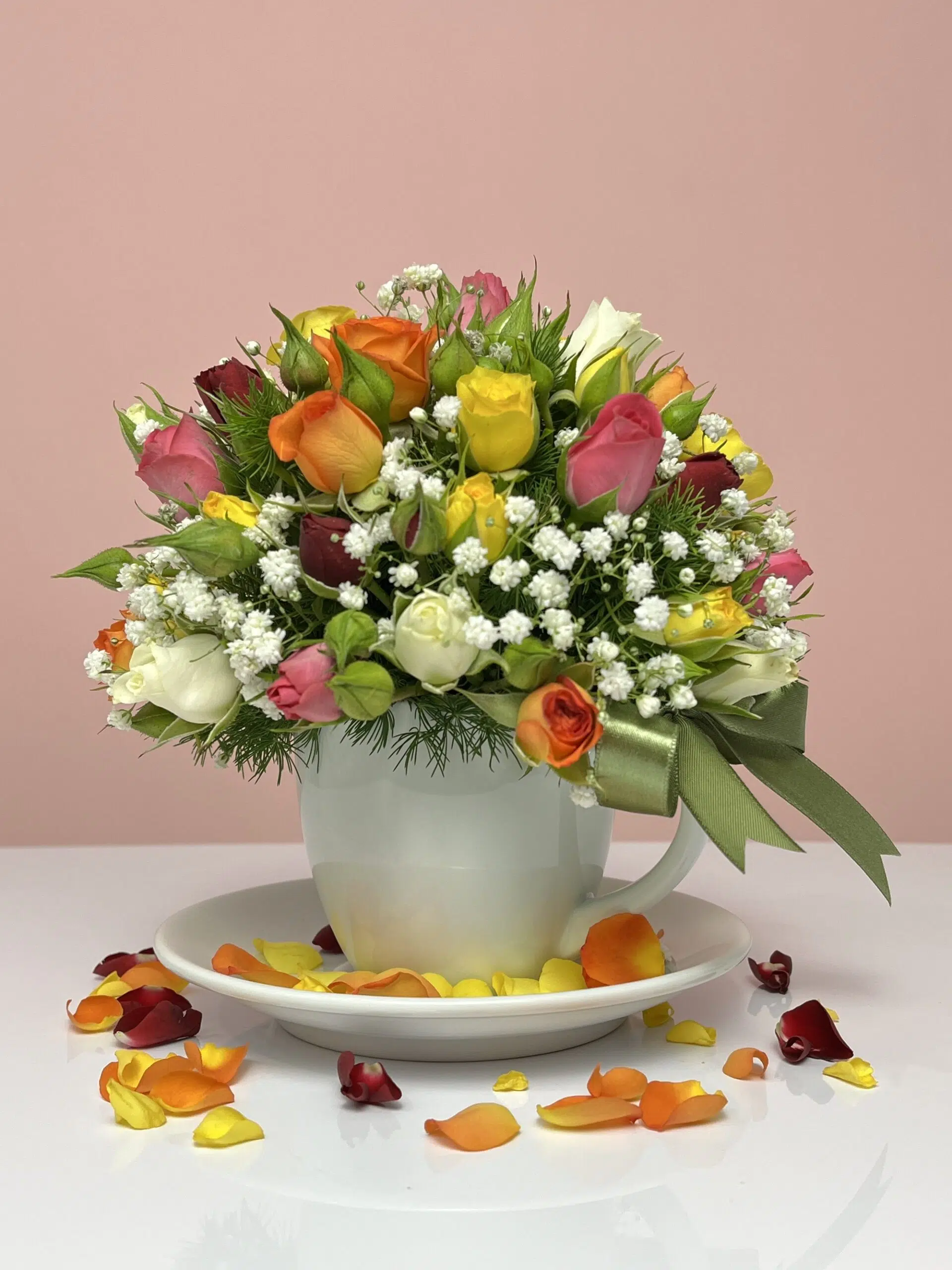 Caminito – Arranjo Miniatura de Mini Rosas Coloridas em Xícara