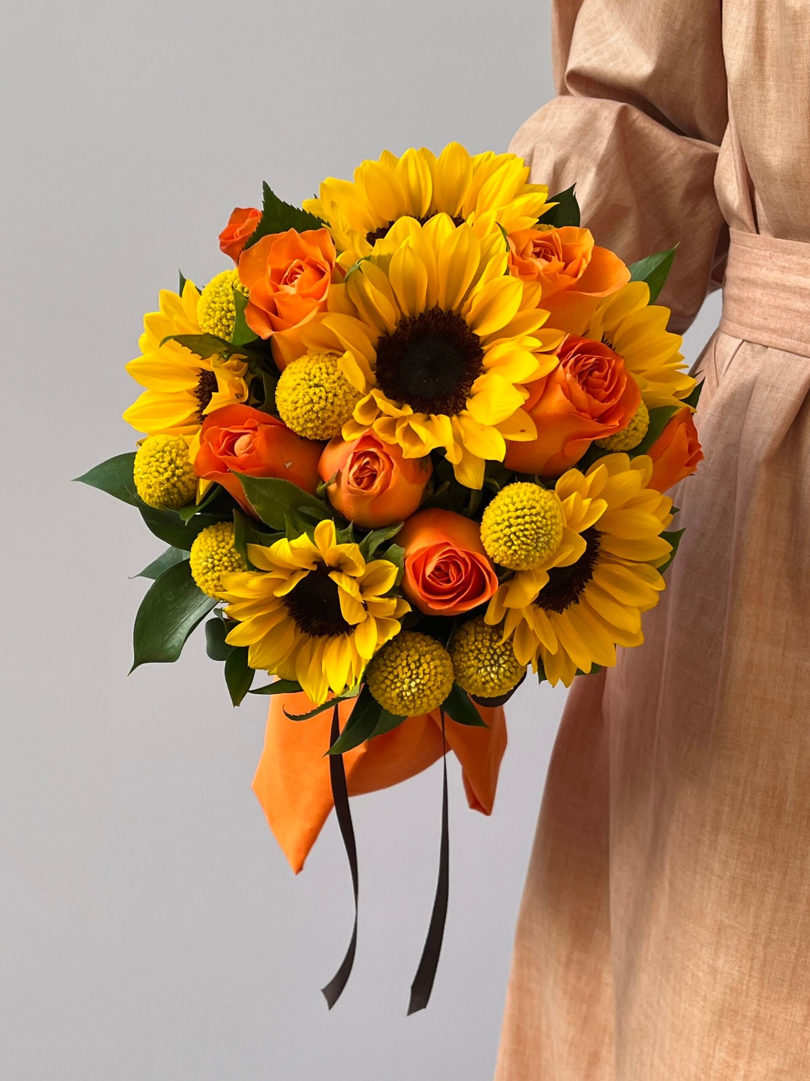 Girassóis, Rosas laranjas, Craspédias, folhas de Ruscus, tecido e laço de gorgorão marrom.
