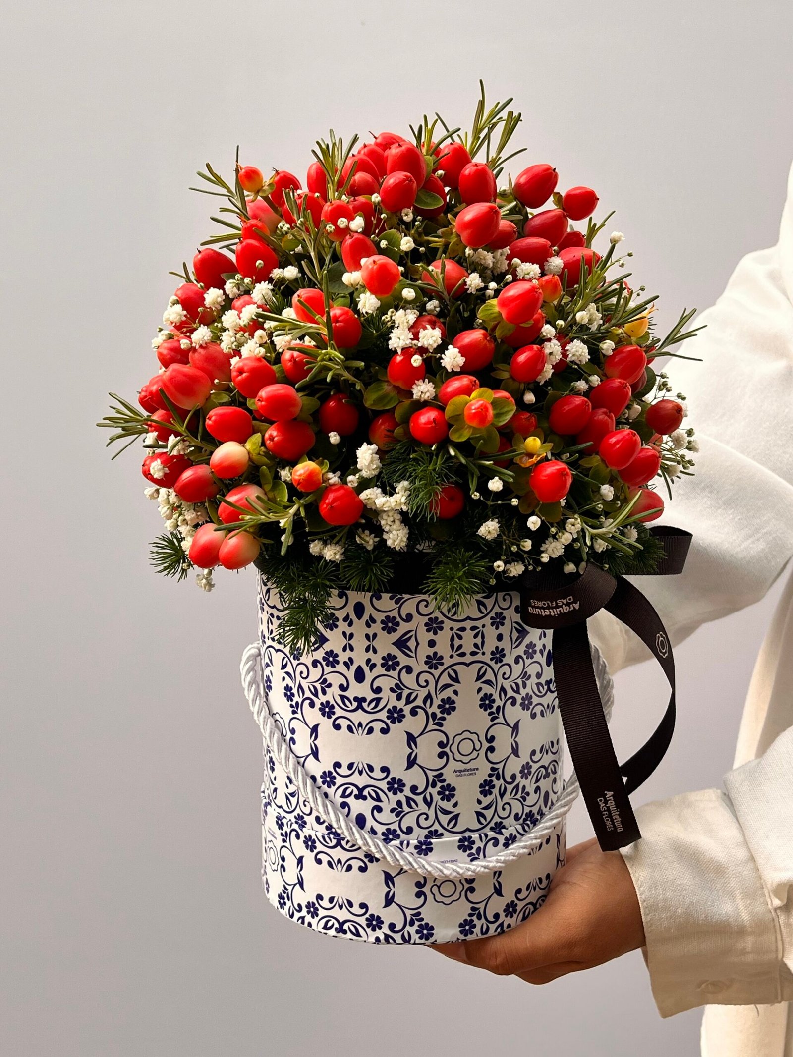 Box de Hypericums, Gypsophilas e fita de gorgorão marrom.