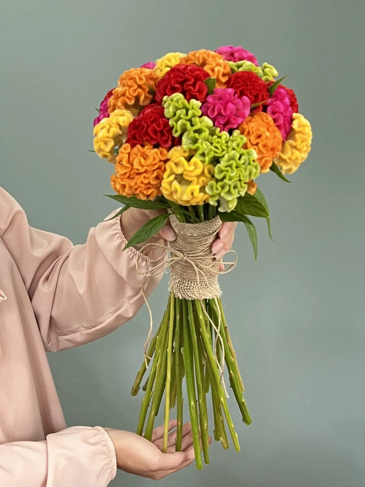 Celósias e laço de rami com juta.
