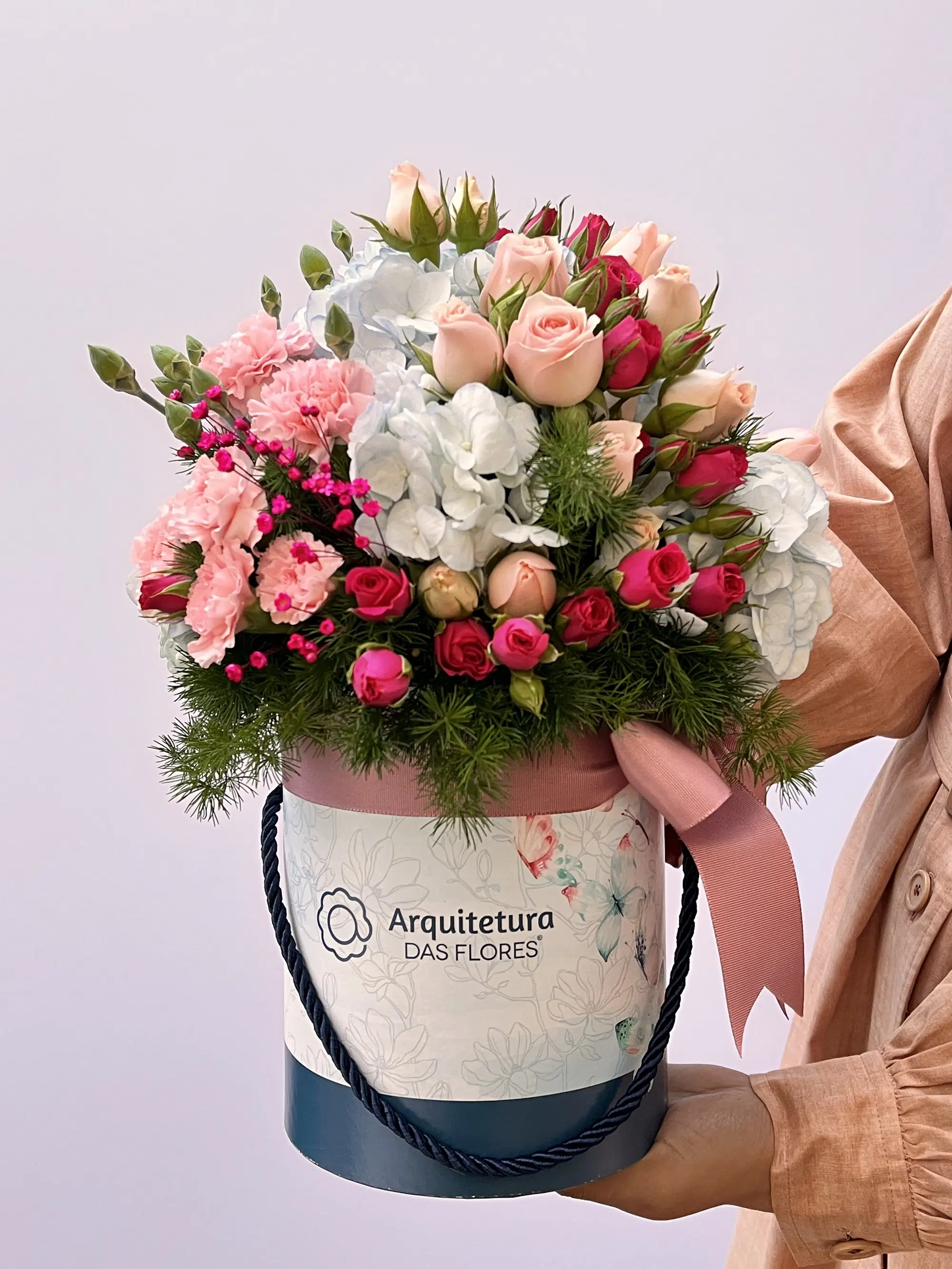 Um arranjo que traduz a delicadeza da estação mais encantadora do ano. Hortênsias em tom de azul céu se unem à suavidade das mini rosas pink e cor-de-rosa, em harmonia com as cravinas delicadas. A composição ganha ainda mais charme em uma box em degradê estampada com borboletas, finalizada com laço de fita rosé.