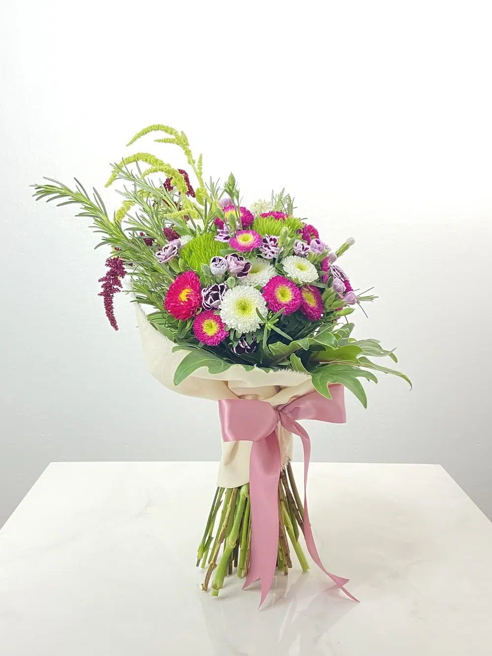 Apresentamos o esplêndido Buquê com Rainha Margarida, Ornithogalum, Dianthus e Cravinas, habilmente arranjados para criar uma harmonia de formas e cores.