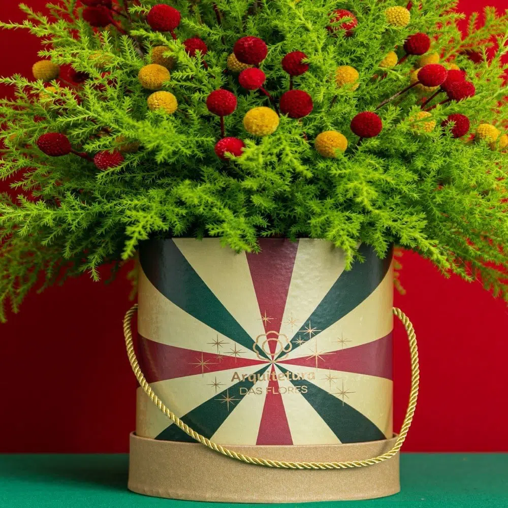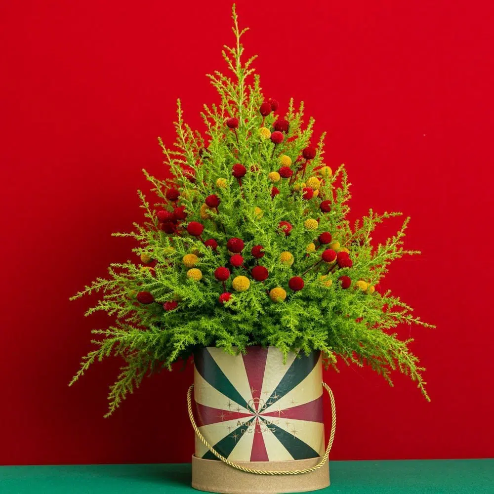 Pinheiro natalino inspirado para a coleção, “Believe: It’s Christmas Time”, na box personalizada Arquitetura das Flores composta por Craspedias amarelas e vermelhas. Perfeito para presentear a pessoa amada!
