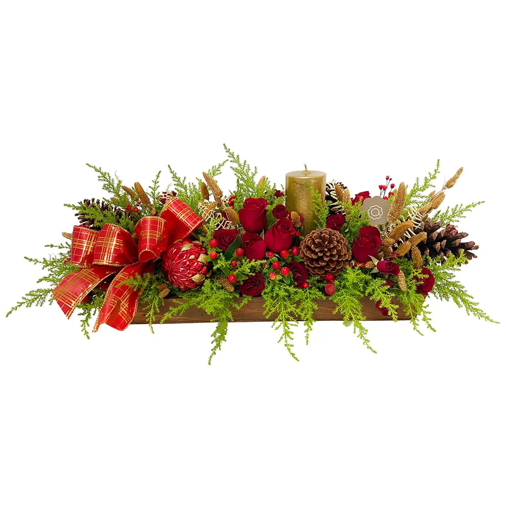 Sofisticado e alegre, o arranjo Chrstimas Dinner é o presente ideal para comemorar os momentos de amor, como na ceia natalina. É composto por Mini Rosas vermelhas, Tuias, Trigo dourado, vela e laço personalizado da Arquitetura das Flores.