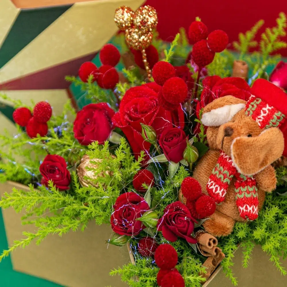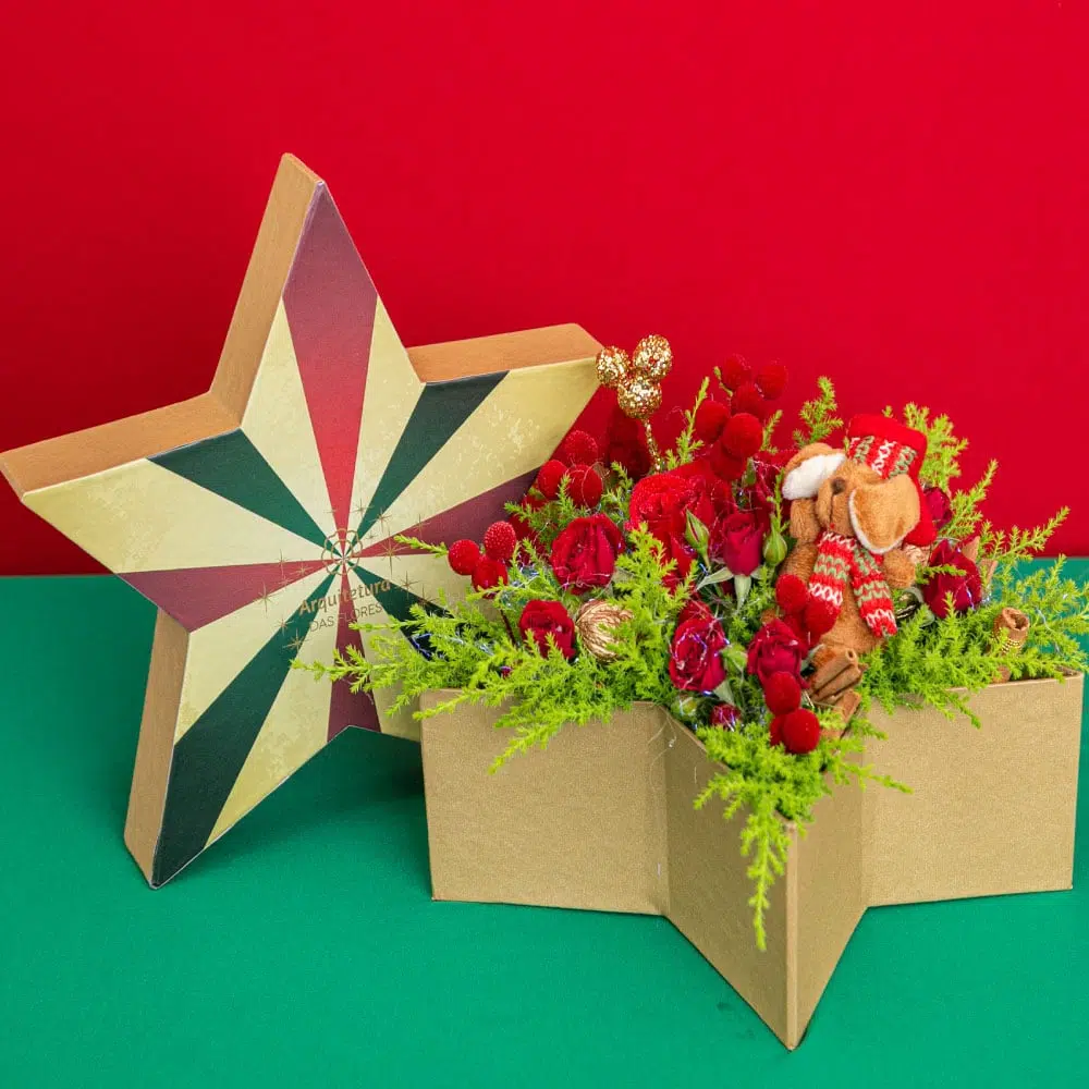 Admirável arranjo em formato de estrela, inspirado para a coleção, “Believe: It’s Christmas Time” composta de Mini Rosas e Rosas com detalhes do Mickey e luzinhas. Perfeito para presentear a pessoa querida!