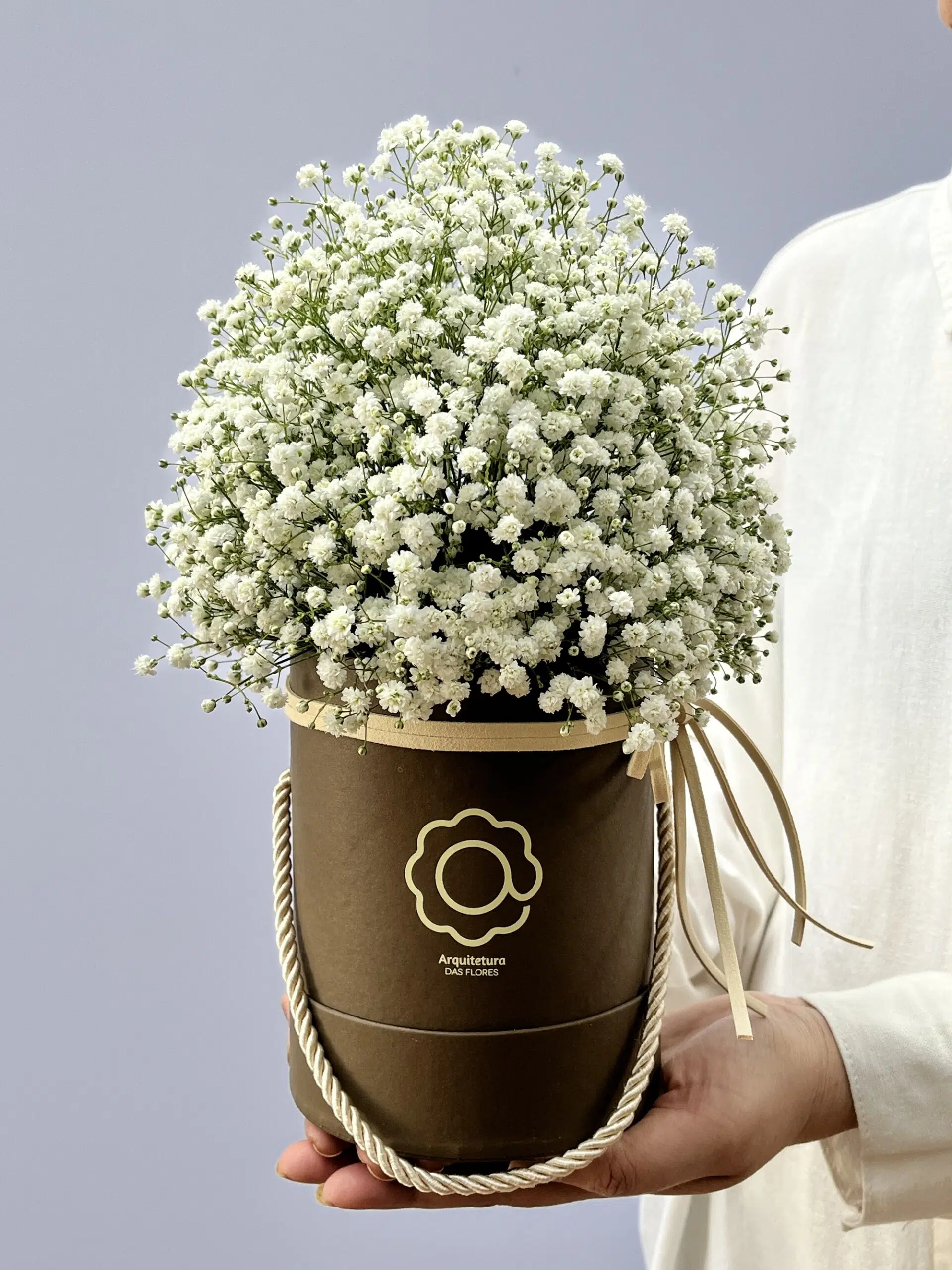 Delicado arranjo de Gypsophilas em boxflower, “Chuva de Prata” é perfeito para presentear com muito encanto.