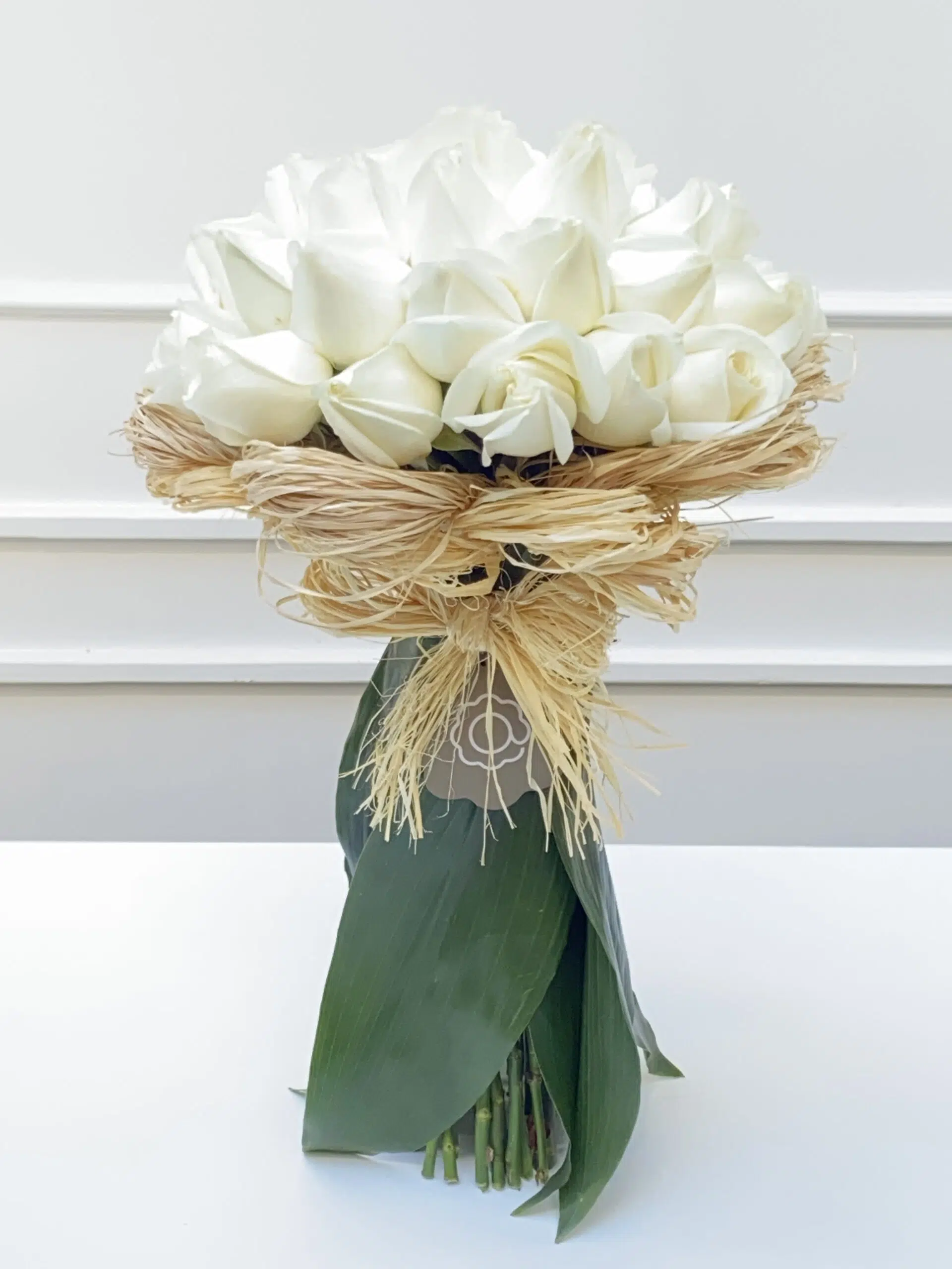 Encantador buquê, composto por 30 Rosas brancas envolto em fios de rafias e verdes, perfeito para comemorar uma data especial com desejos de vida e de luz.