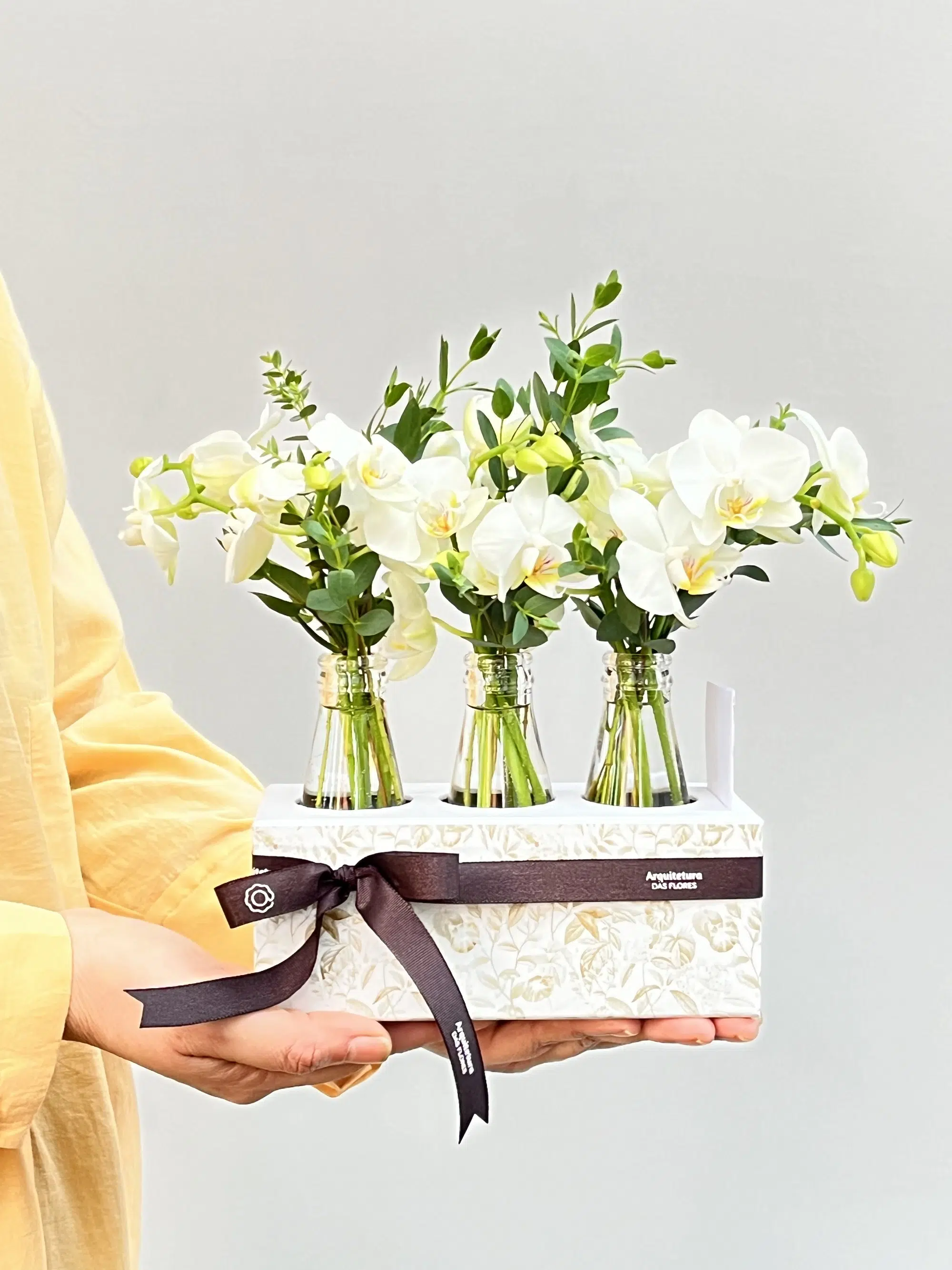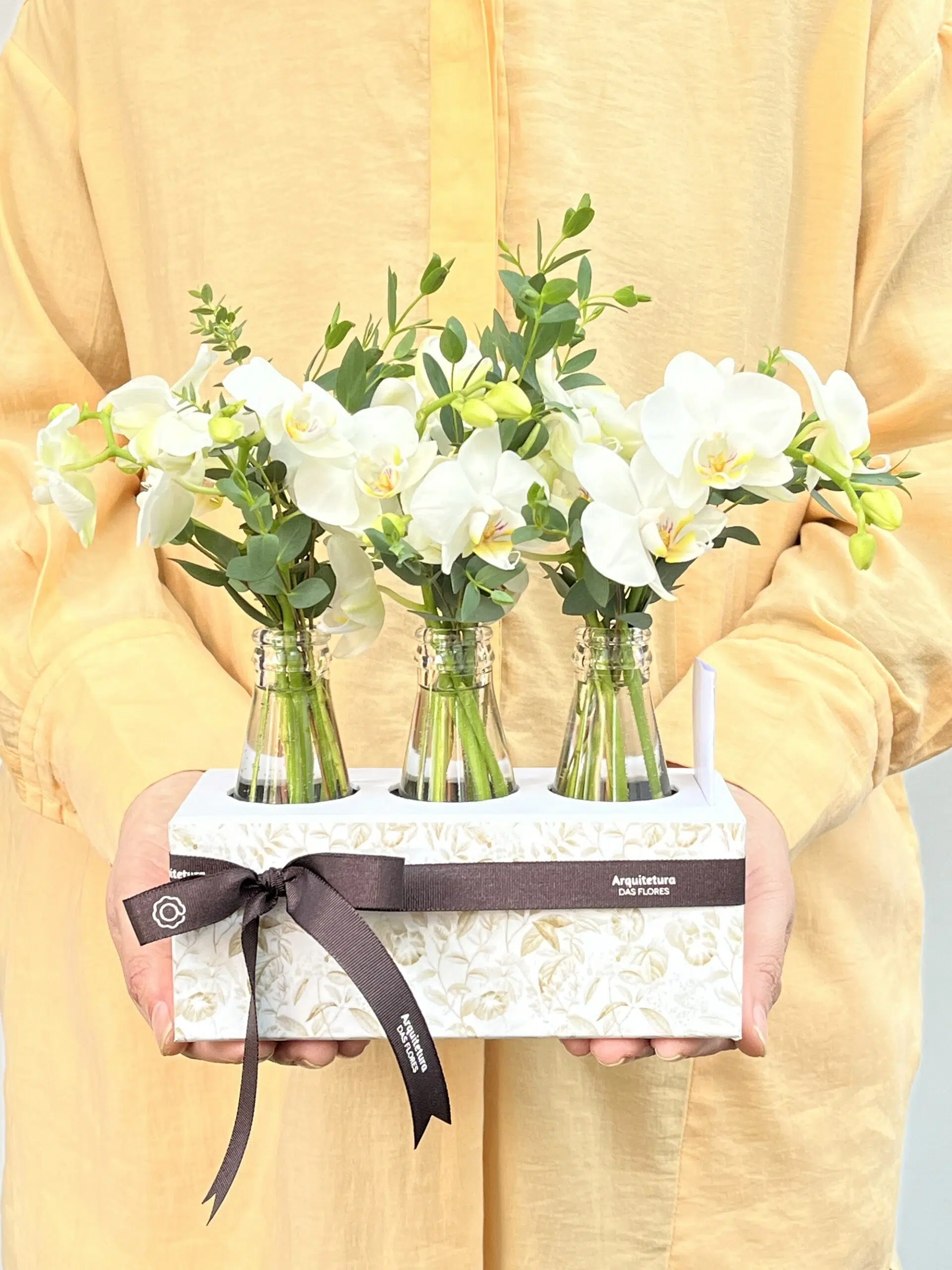 Box de Mini Orquídeas Phalaenópsis brancas em garrafinhas de vidro.