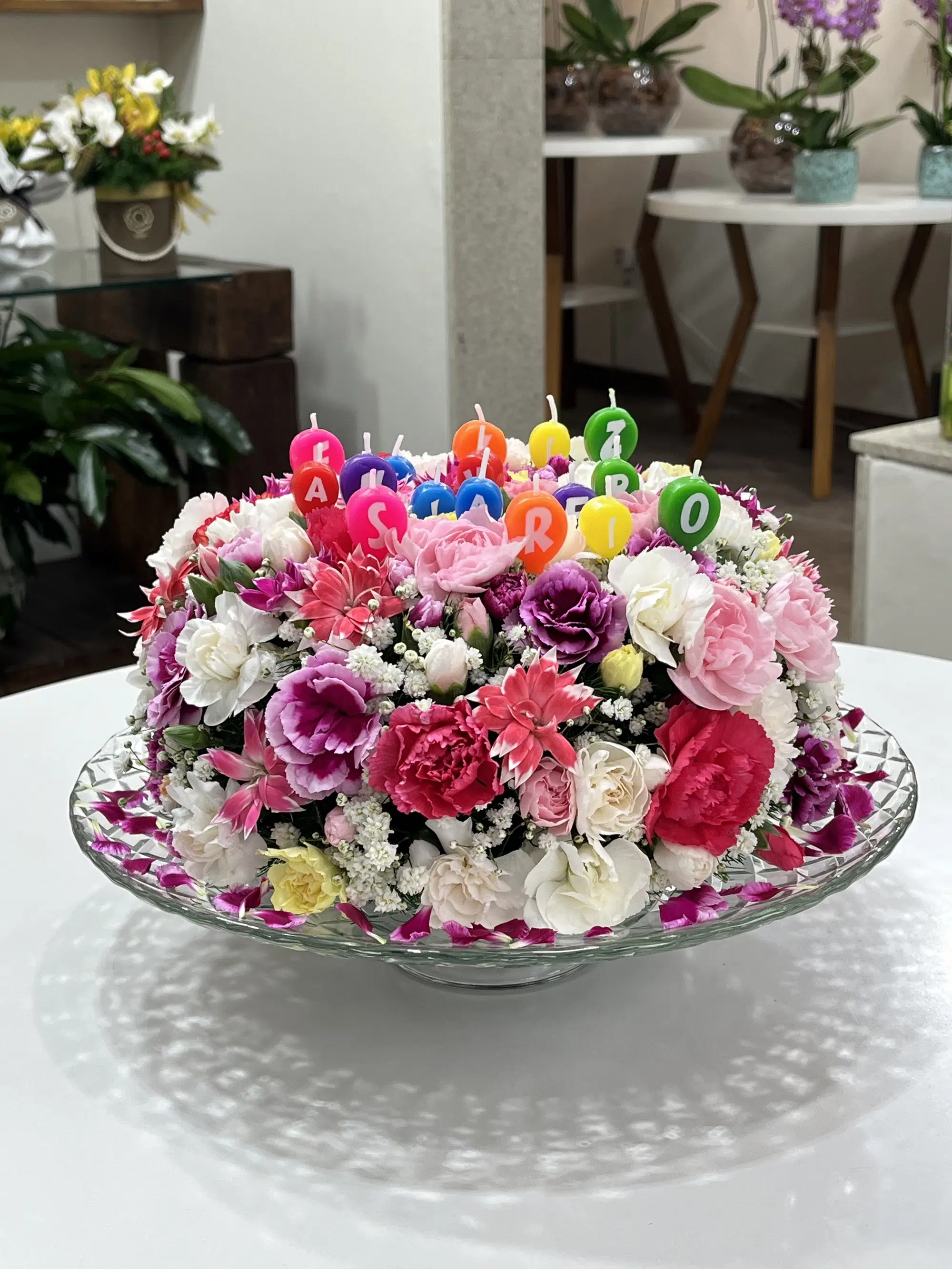 Colorful Cake é uma explosão de cores, delicadeza e alegria. Um “bolo” feito inteiramente de Cravinas coloridas, cuidadosamente acomodadas sobre um prato de vidro, acompanhado de velas que formam a palavra Feliz Aniversário.