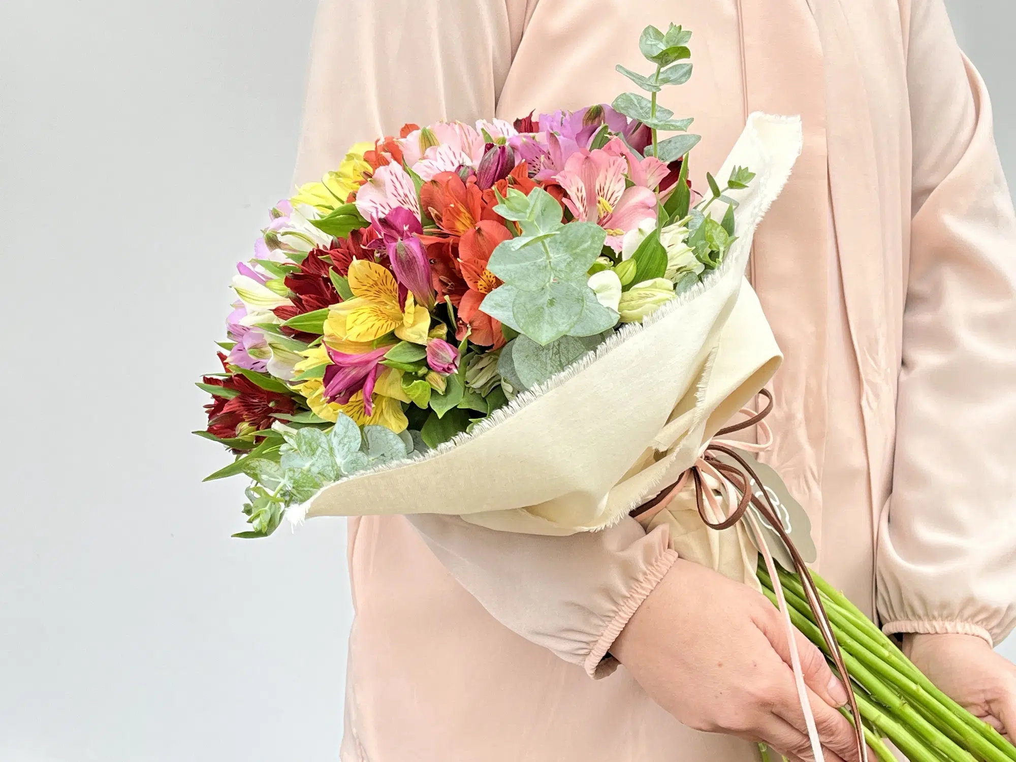 Buquê alegre de Astromelias coloridas envolto de tecido de algodão cru e fita de camurça.