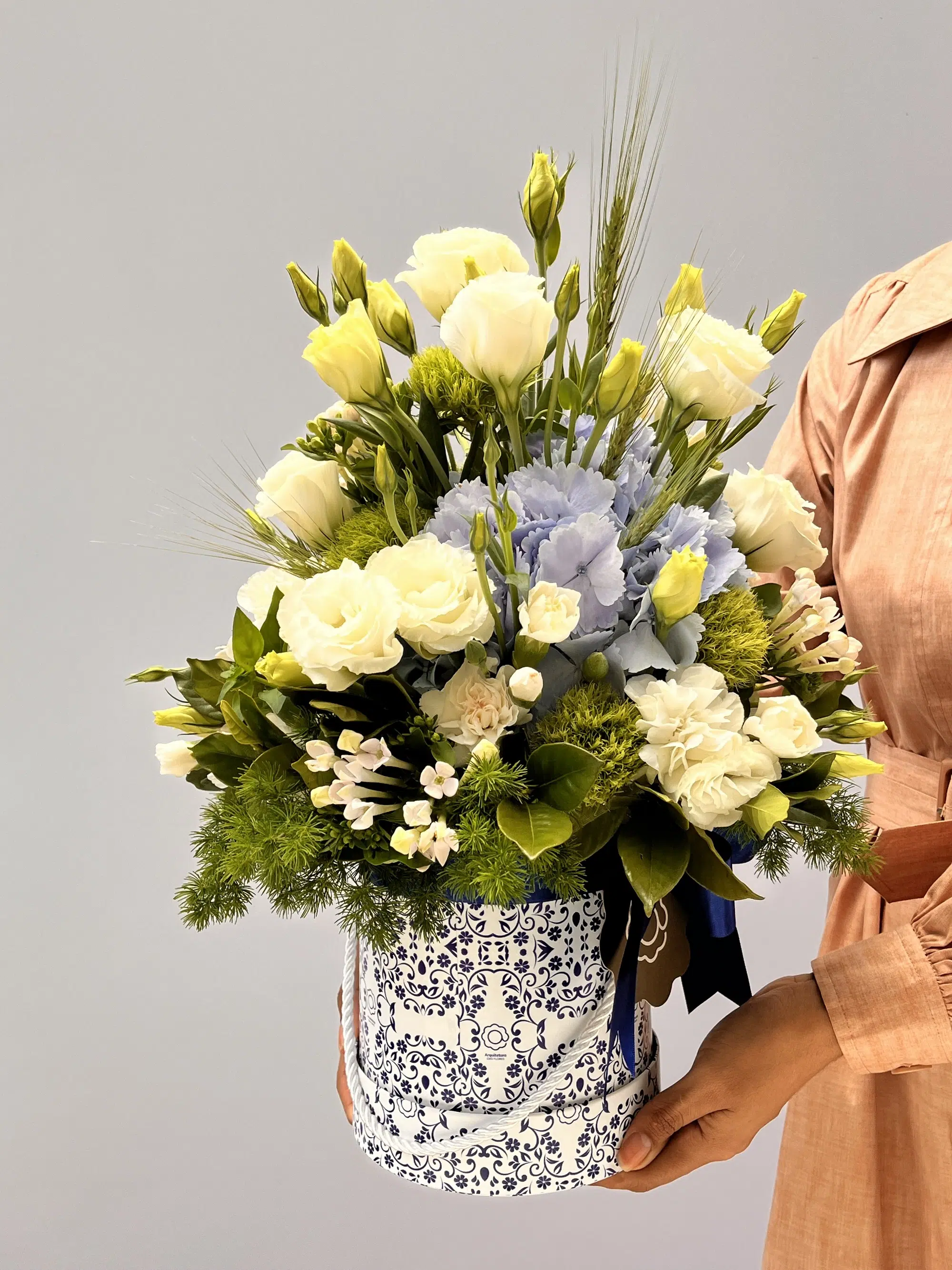 DeFranci é uma composição elegante que une Hortênsias e mix de Flores brancas. Uma box que transmite serenidade e celebração, perfeito para marcar conquistas e compartilhar momentos especiais com delicadeza.