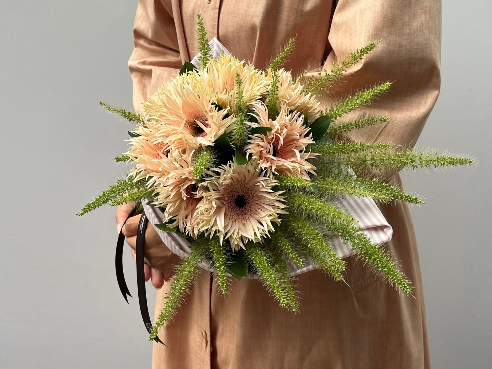 Buquê de 12 Gérberas na cor champanhe, com Capim plumoso, envolto em tecido de algodão e fita de gorgorão marrom.