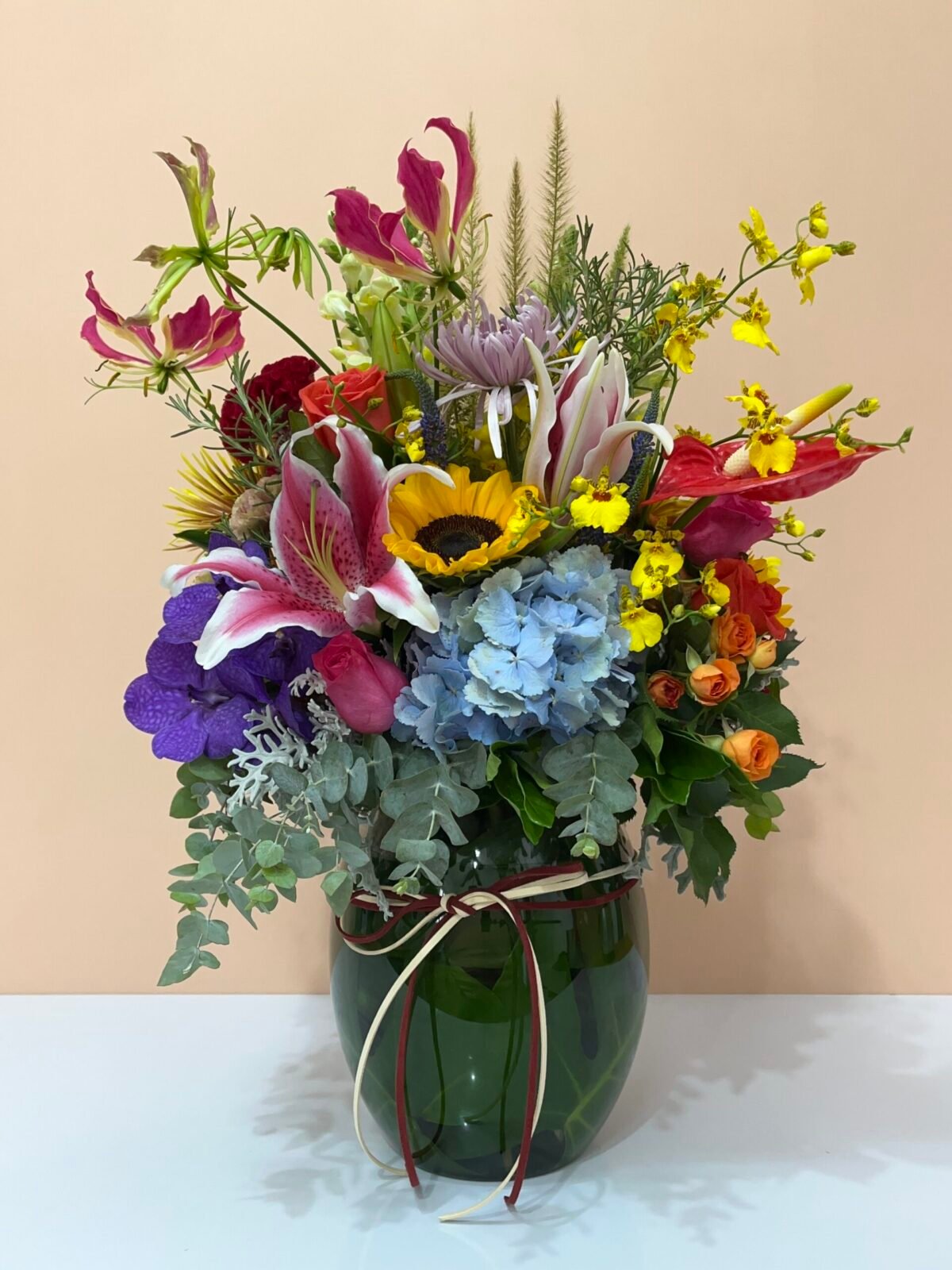 Por esse motivo, podem ocorrer sutis variações na quantidade, nas cores ou nos tamanhos das flores, singularidades que tornam cada arranjo único, como cada gesto de amor.