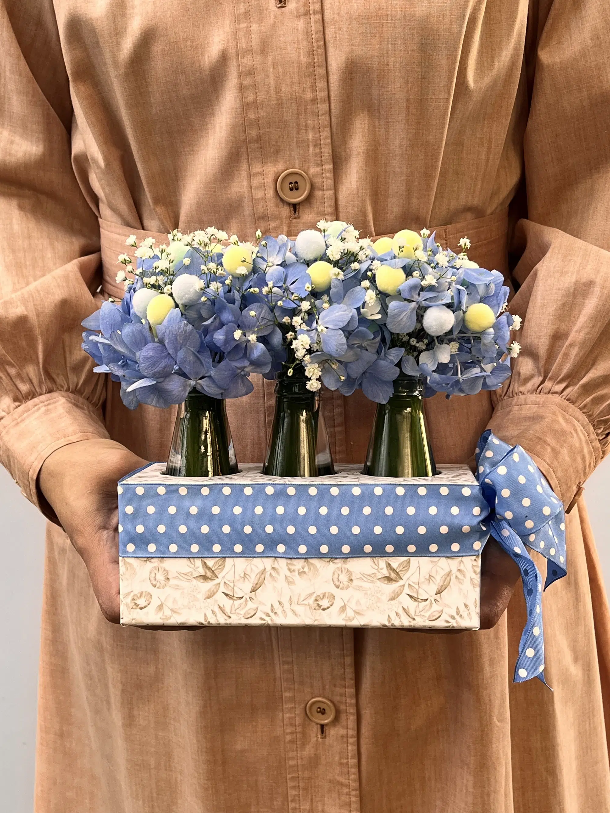 Uma composição em trio de mini vasos de vidro com Hortênsias azuis, Gypsophilas e Pompons de algodão dispostos em caixa decorada com fita de poá.