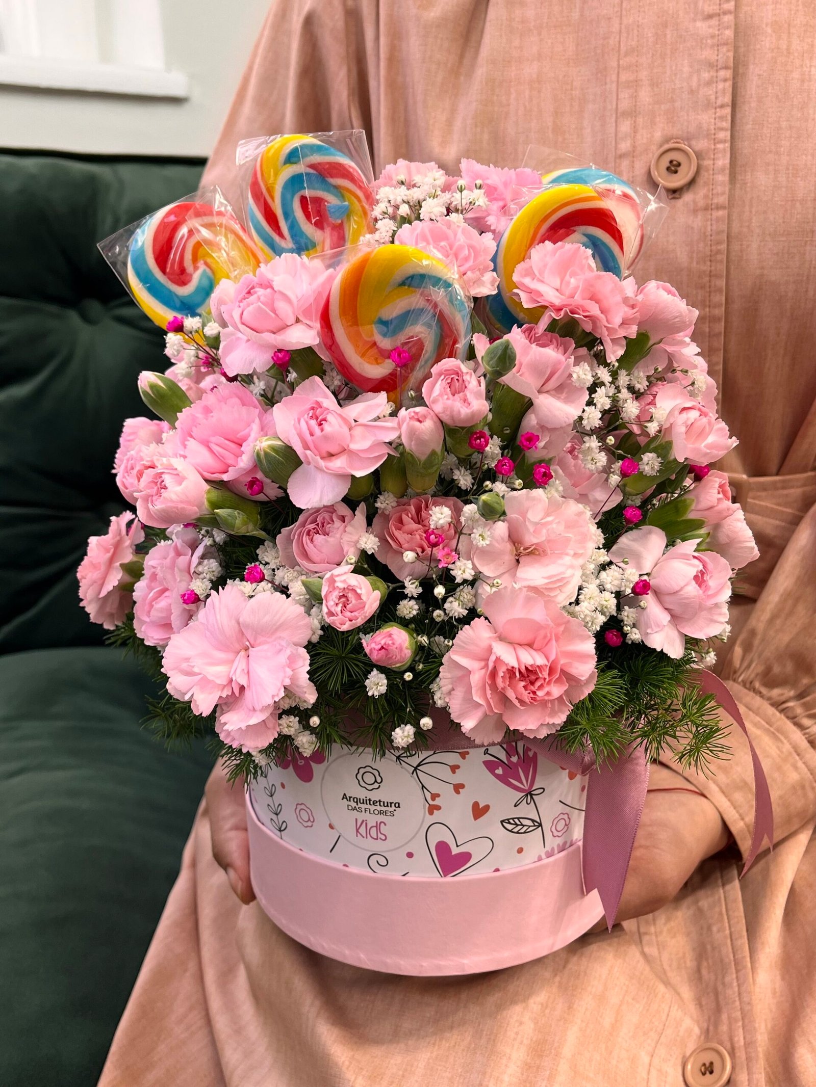 O arranjo Doce Encanto traz a leveza e delicadeza das Cravinas em tom rosa claro, combinadas com divertidos pirulitos coloridos que despertam sorrisos e memórias doces.