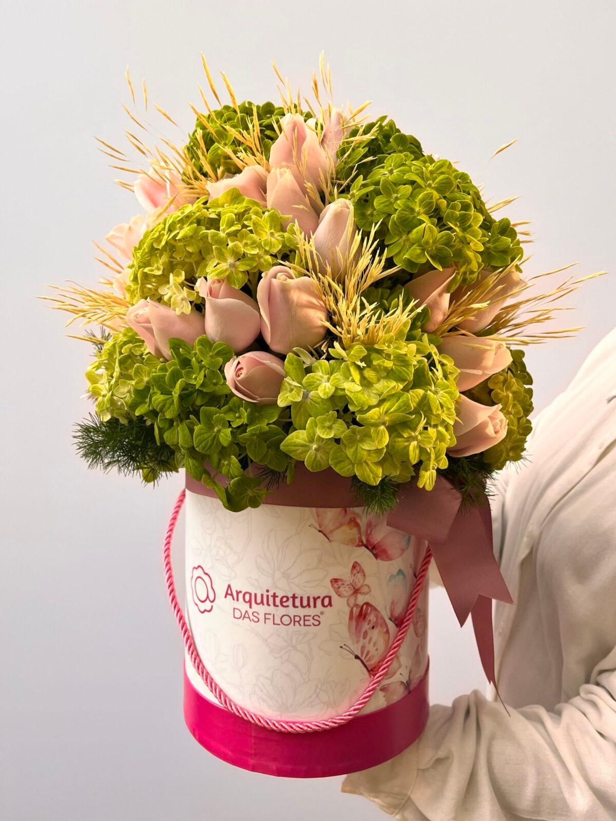 Box, hortênsias, rosas, flores desidratadas e laço de cetim.
