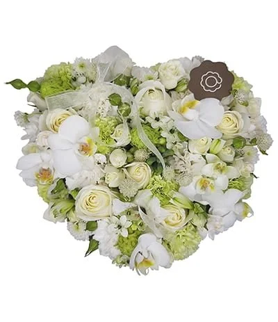 Belo e perfumado arranjo Athenas em forma de coração com as mais delicadas flores brancas, tudo perfeitamente harmonizados para presentear com muito carinho.