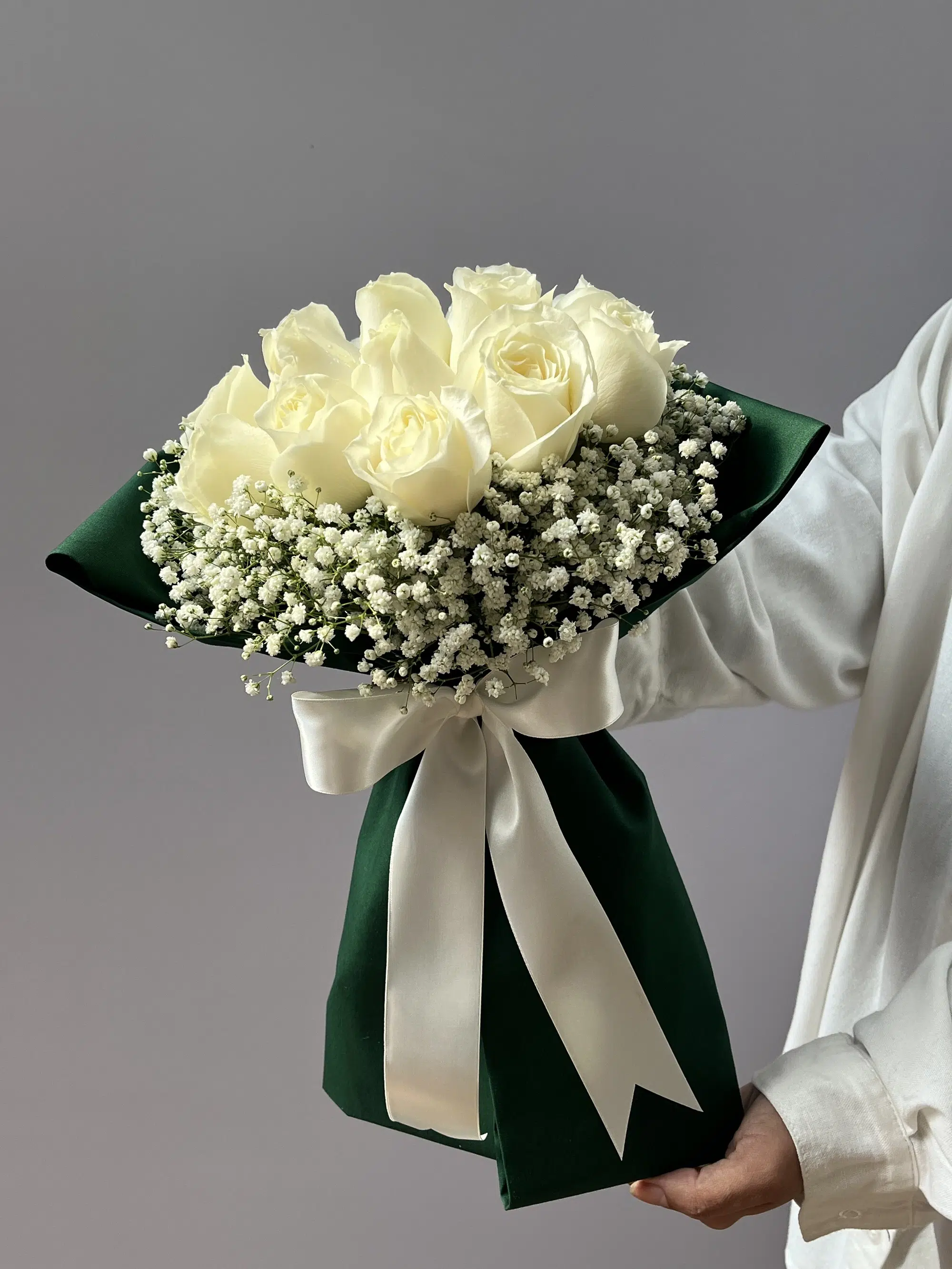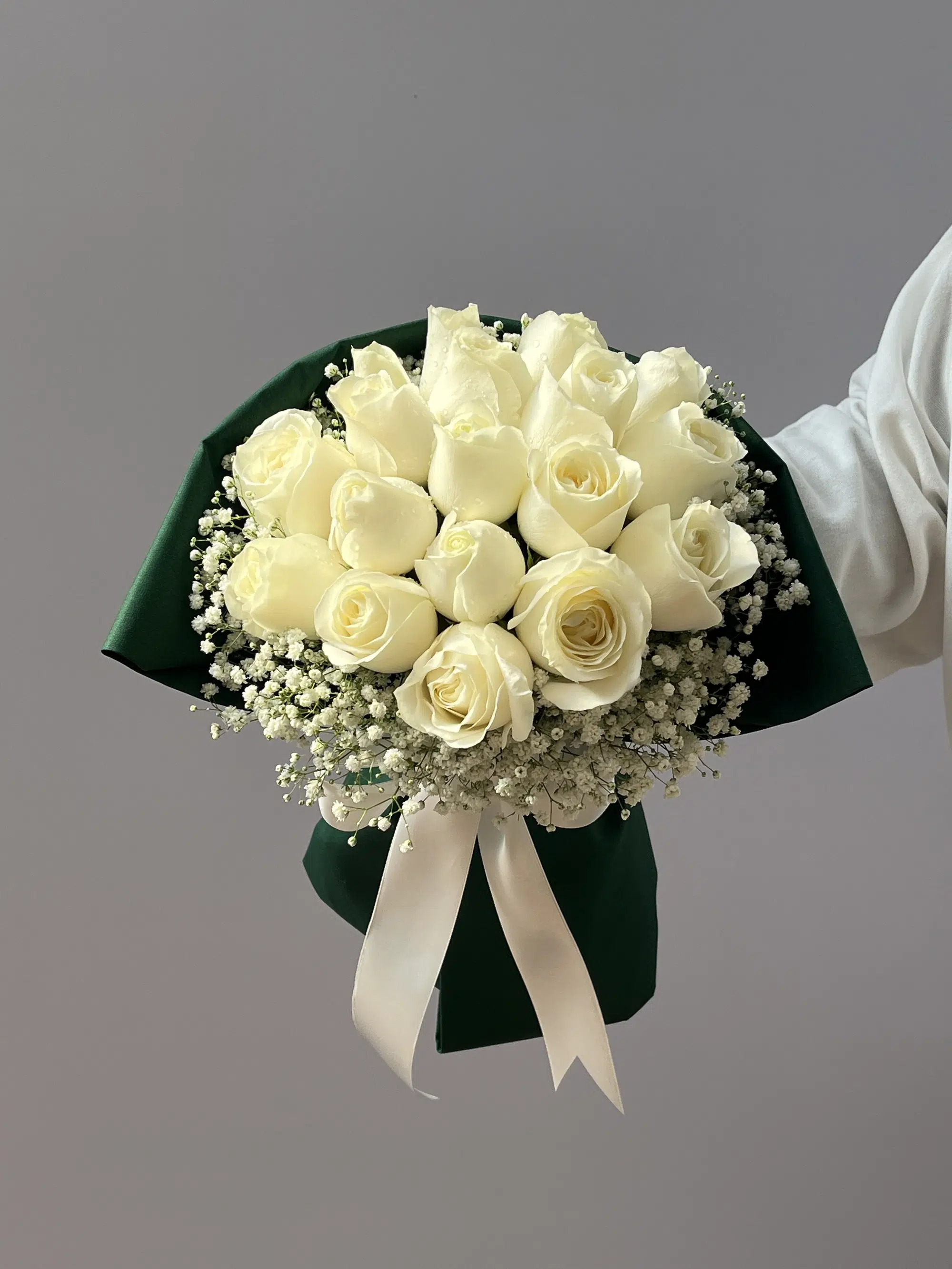 Buque de 18 Rosas Brancas e Gypsophilas em tecido de algodão e laço de cetim.