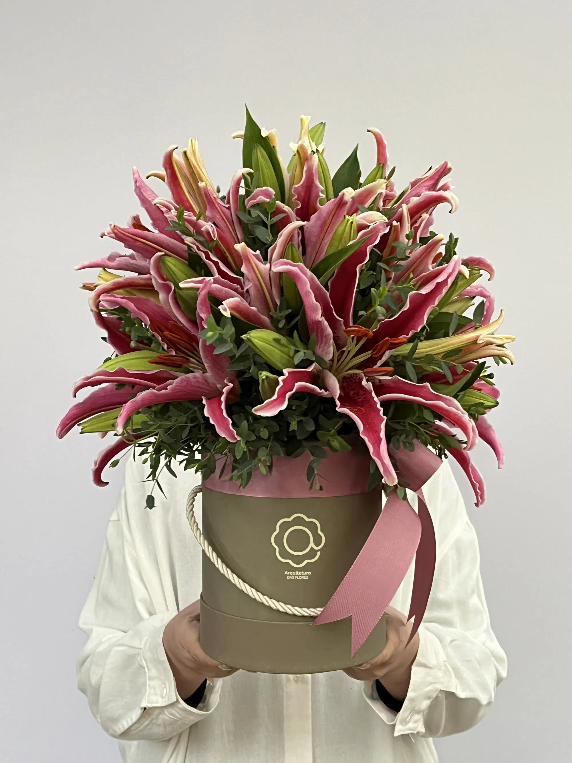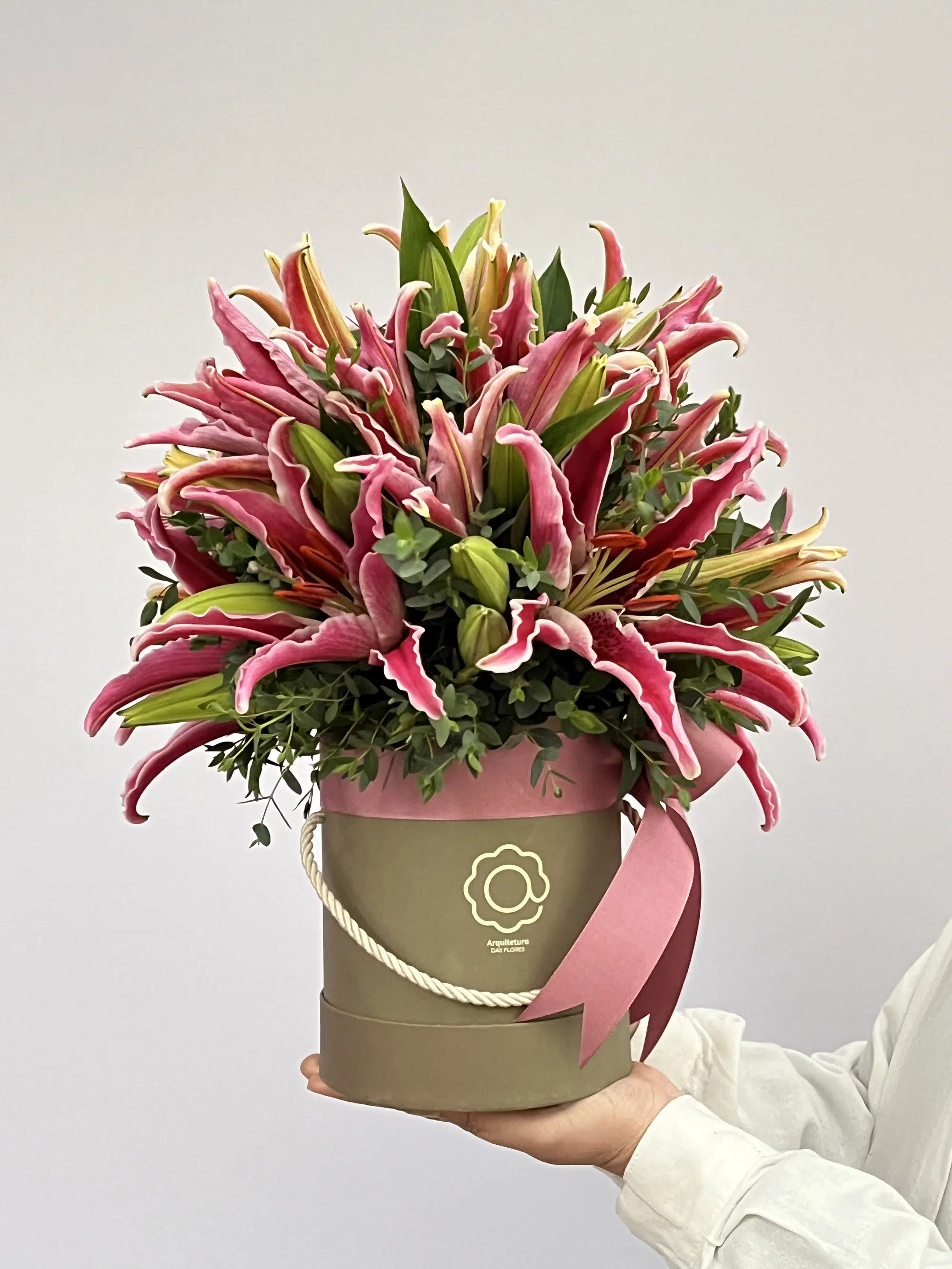 Com seu perfume delicado e formas marcantes, os Lirios na cor rosa formam esse belo arranjo box “Emilia“.